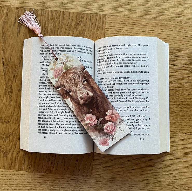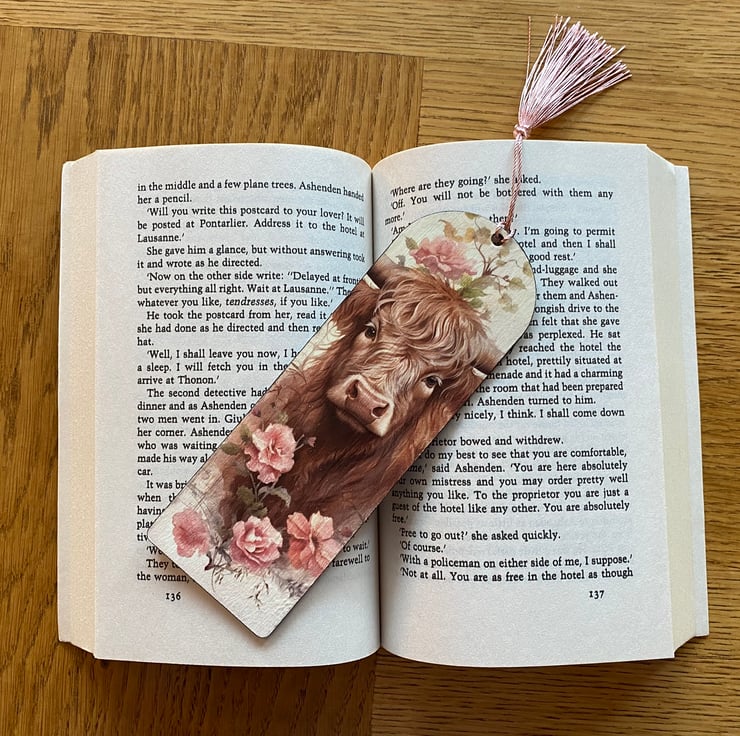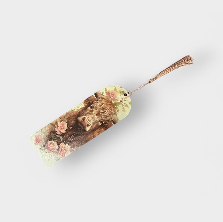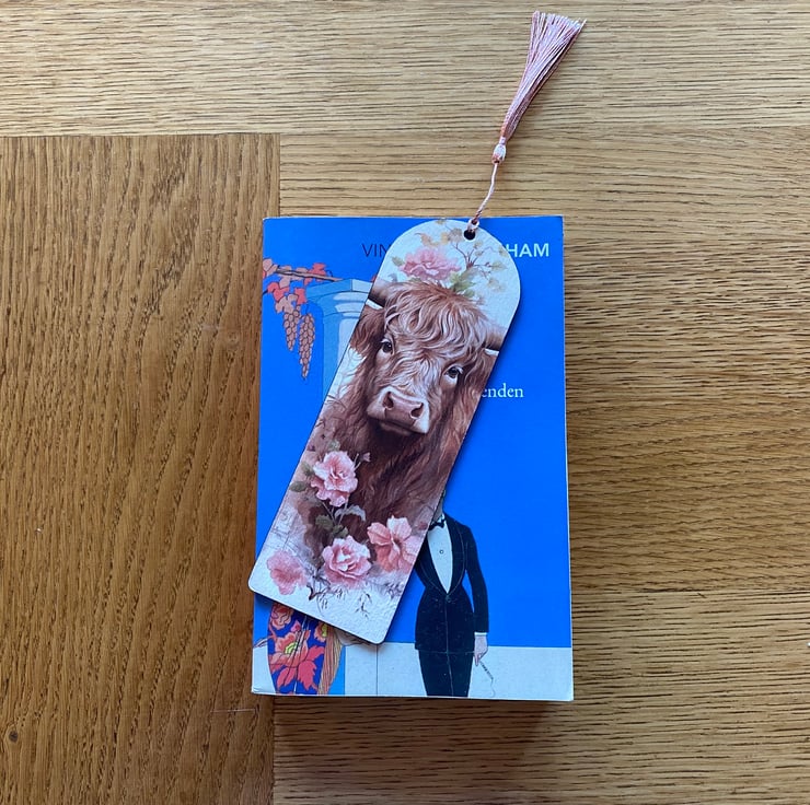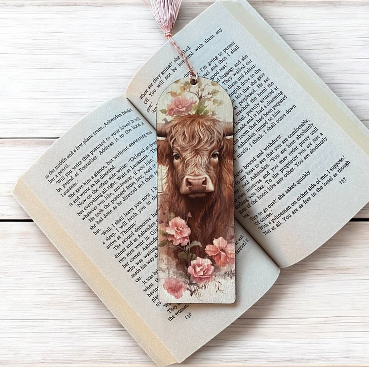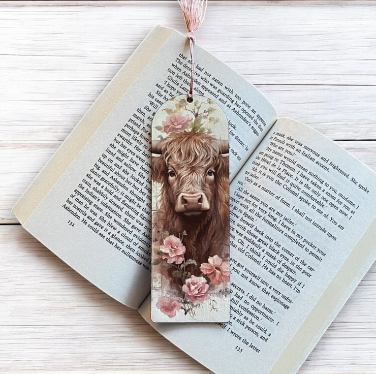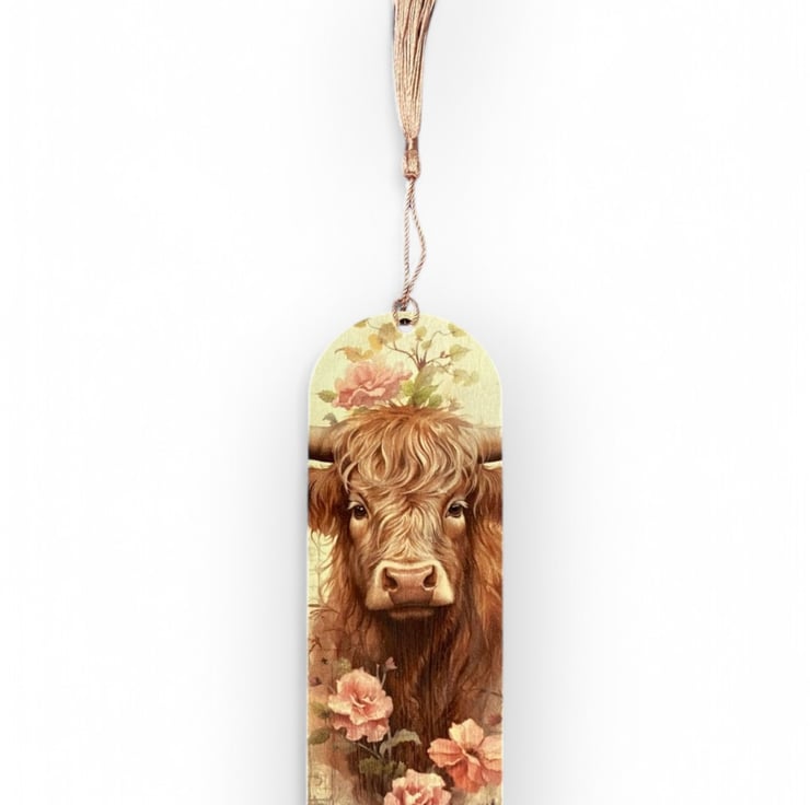 Wooden decoupage bookmark, featuring a highland cow. Made from 2mm MDF, these bookmarks are lightweight, durable, and perfect for book lovers. Each one is carefully decorated using the decoupage technique. Approxmately 17.5 x 6cm x 2mm.
