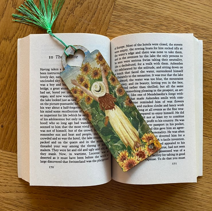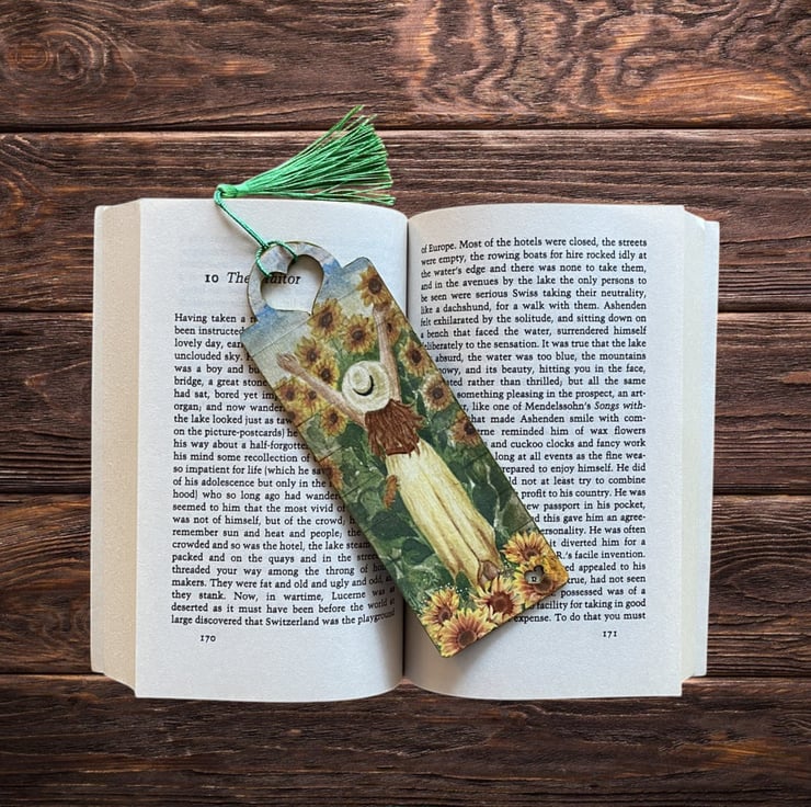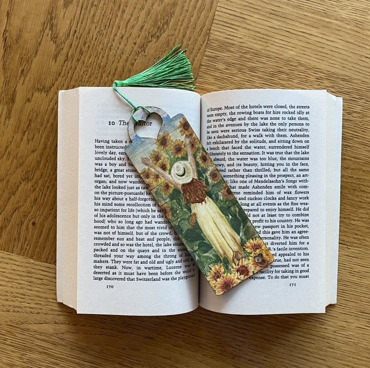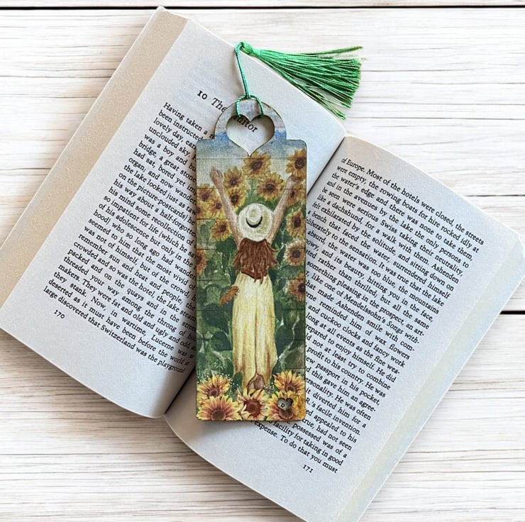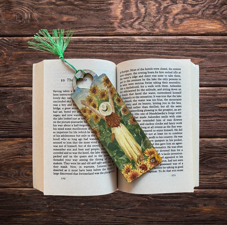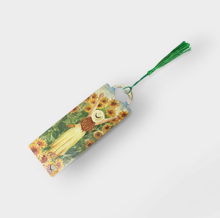 Wooden decoupage bookmark, featuring a girl in a field of sunflowers. Made from 2mm MDF, these bookmarks are lightweight, durable, and perfect for book lovers. Each one is carefully decorated using the decoupage technique. Approxmately 17.5 x 6cm x 2mm.