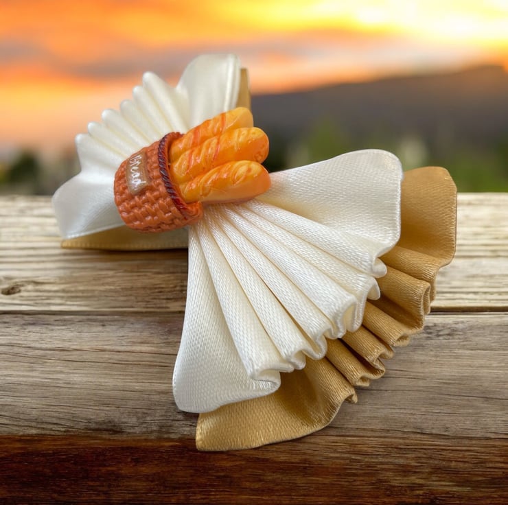 French bread stick themed hair bobble "Rock that chic French look with our French bread stick basket inspired hair bobble. This hair accessory doubles as a deliciously stylish conversation starter, perfect for foodies and fashionistas alike!"