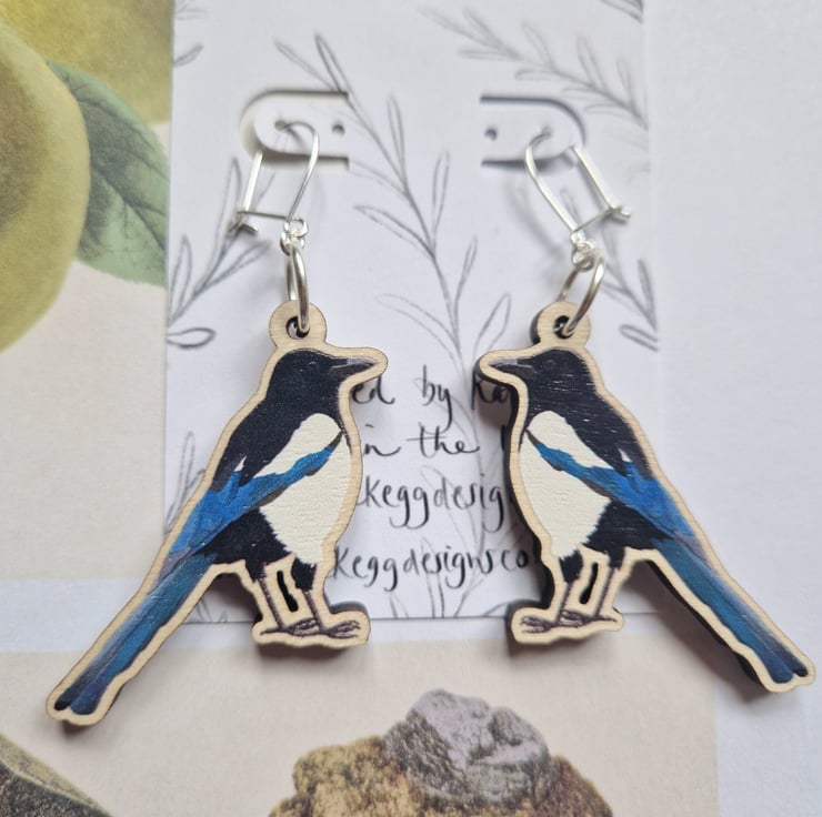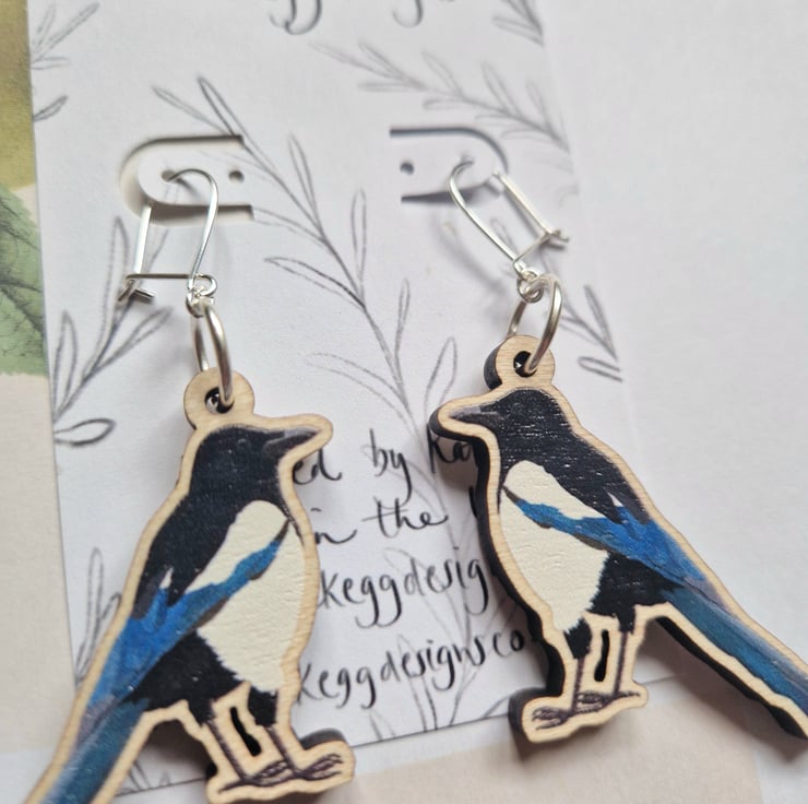 Lightweight magpie earrings featuring my artwork on FSC certified wooden charms.
