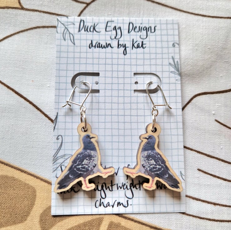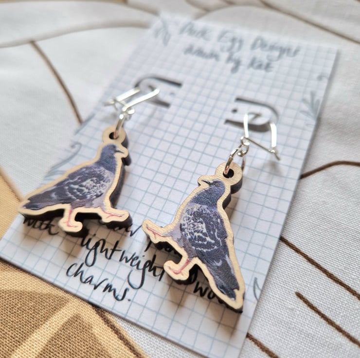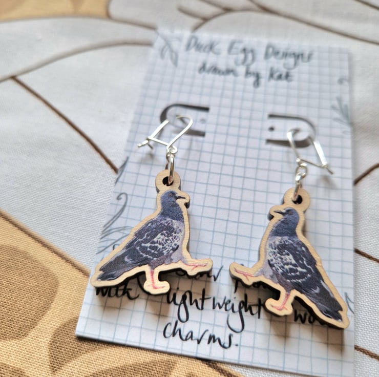 Pigeon earrings designed by me and made using FSC certified wooden charms.