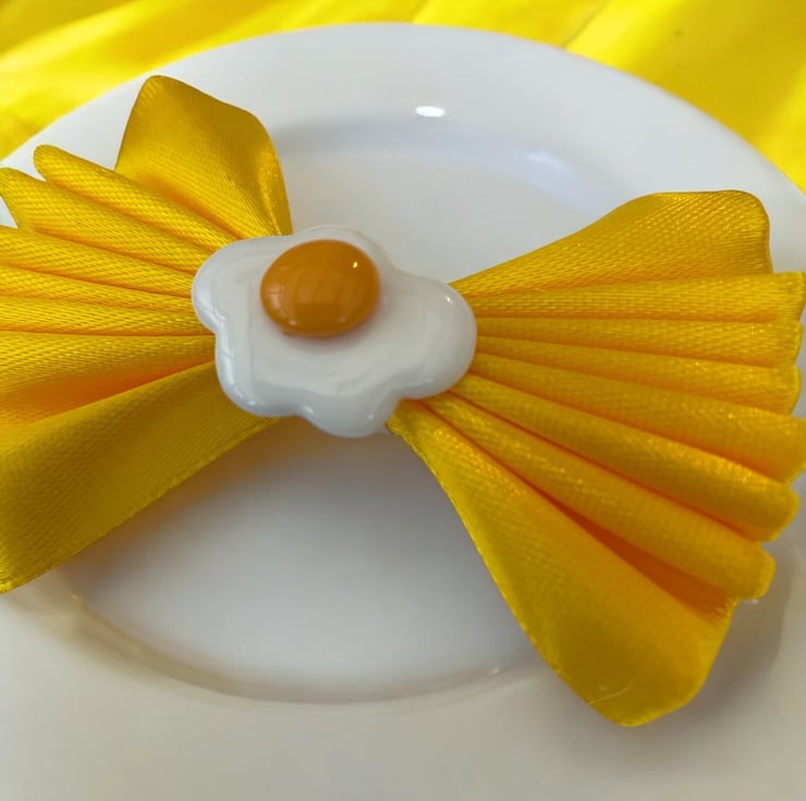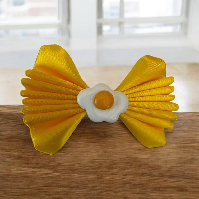 Elevate your style with this unique fried egg themed single satin ribbon. Measuring 8cm in length, it features a crocodile clip for easy attachment. Perfect for adding a quirky touch to your outfit or as a fun hair accessory.