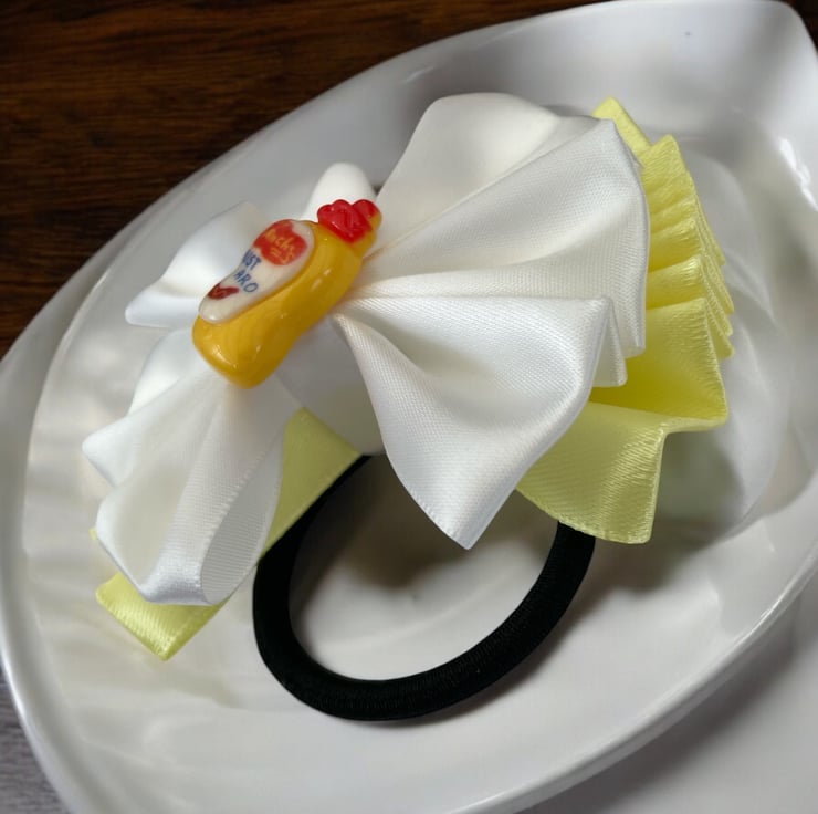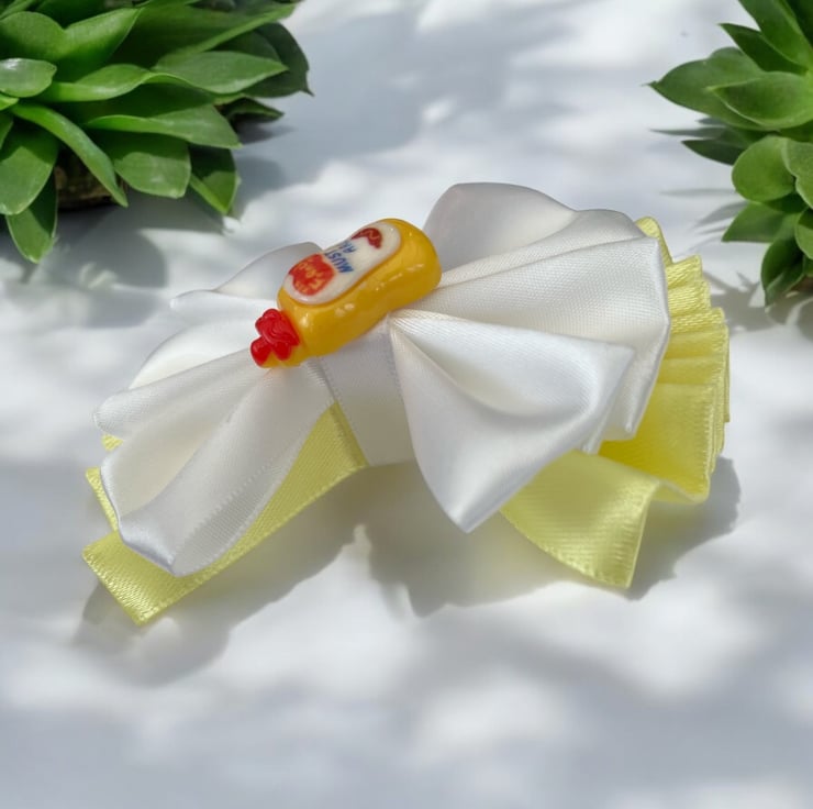 This quirky hair bow is perfect for the condiment lover in your life! Featuring a mustard bottle design, this bow is made from single and double satin ribbon and attached to a Denman hair bobble. A fun and playful addition to any outfit!