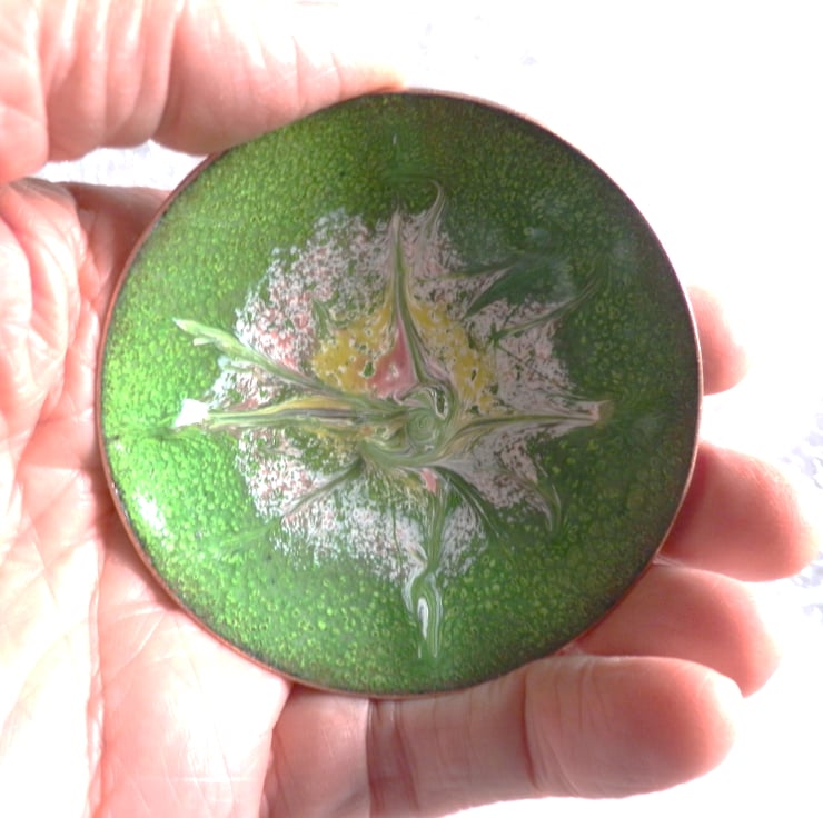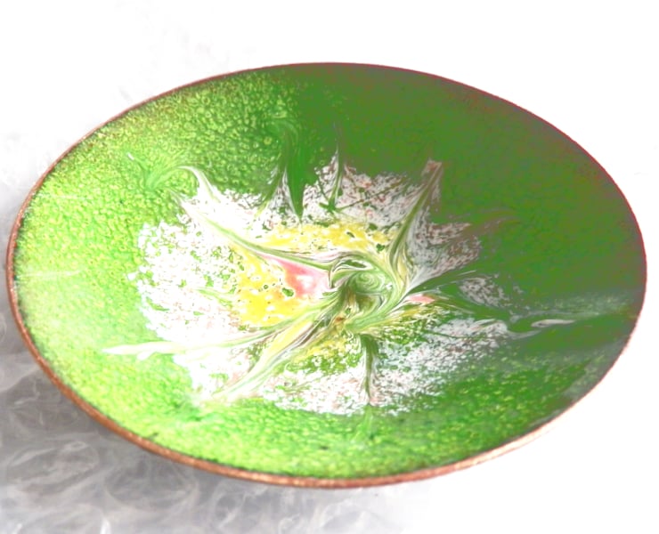 After developing the inner surface of the bowl with layers of clear enamel and then green enamel I scattered small piles of white, pink and yellow enamels on the surface then made the pattern by drawing a steel tip through the surface while the bowl was in the kiln at 700 degrees, but cooling as the kiln door was open. In this situation the colours cannot be distinguished and the enamel is solidifying around the steel point. At the end of the day I accept the design the process allows me. The random pattern I have managed to generate suggests to me apple blossom that has fallen on a lawn.