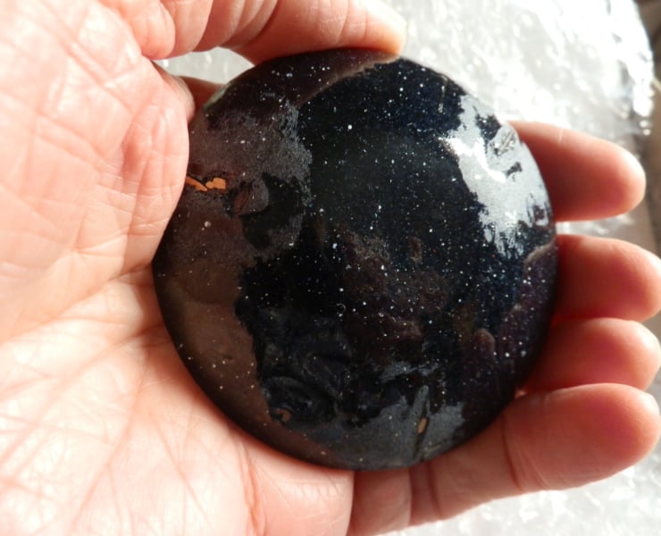 The bowl is 74mm in diameter and 20mm deep. You might use it as a dressing table tray or a table centrepiece. Among other uses, customers at fairs have suggested that my bowls may be just the thing to use to drop a tea bag on when you take it from your mug or cup or may make good soap dishes.