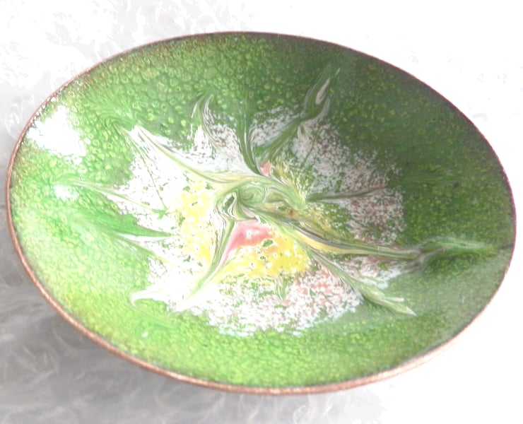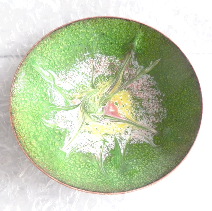 This is a copper bowl decorated with glass enamel. The random pattern I have managed to generate suggests to me apple blossom that has fallen on a lawn.