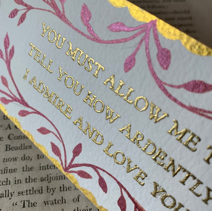 The design is very pretty, using a combination of embossed and hand painted elements. The metallic watercolour adds a beautiful shimmer to each bookmark, especially to the scalloped border