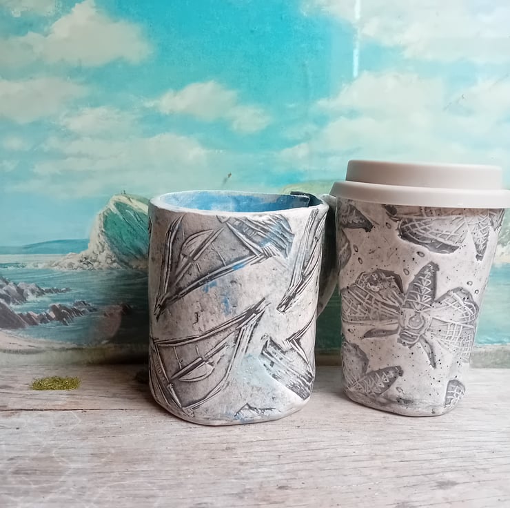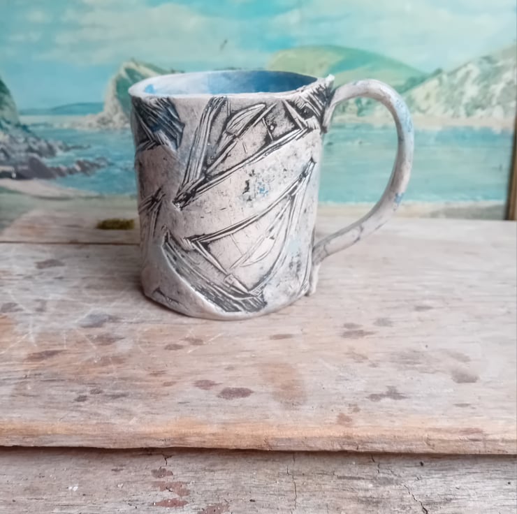 Sailboat coffee mug, in white and blue, handpainted colours varies each time, earthenware clay, handbuilt and low fired to save energy, designs are made with my hand carved linocuts.
