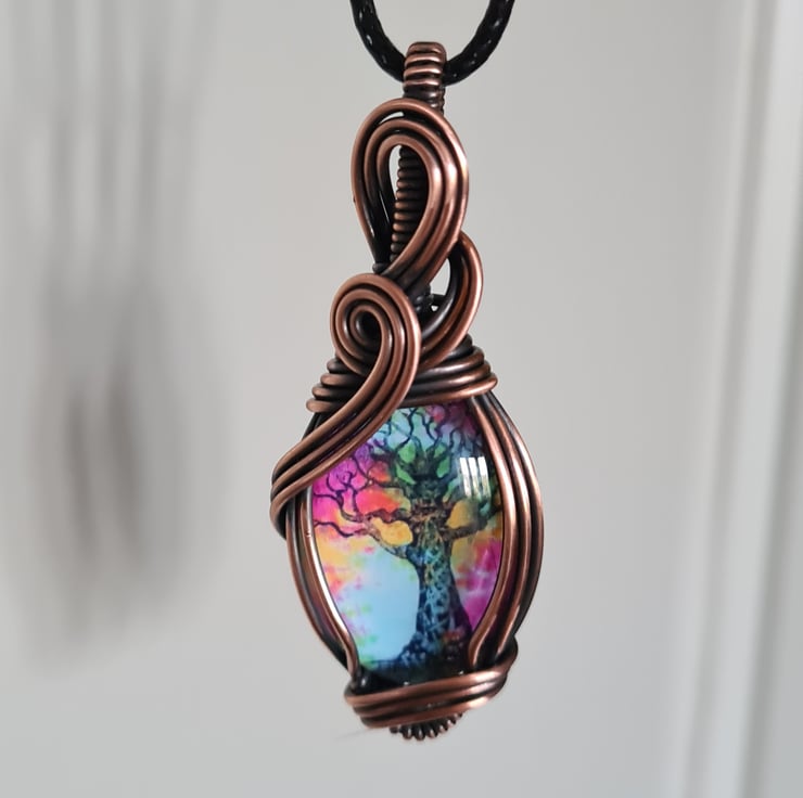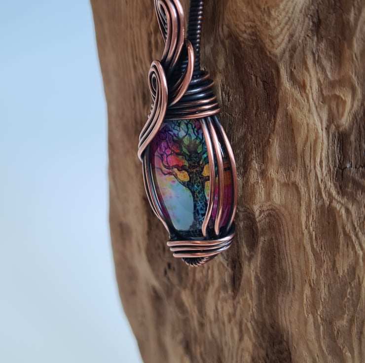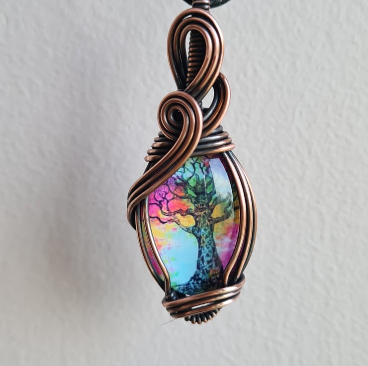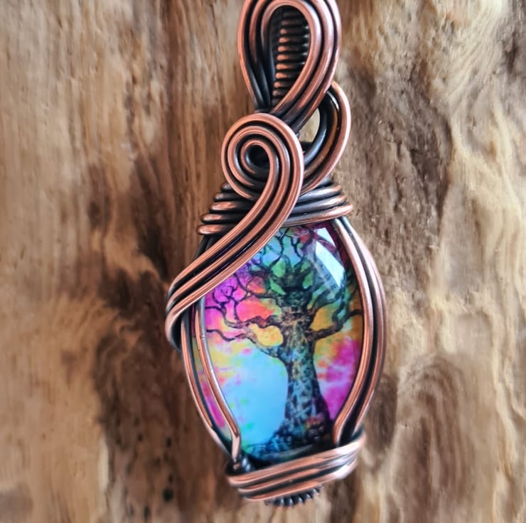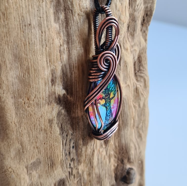 I have handcrafted this beautiful and one of a kind pendant using this lovely glass cabochon featuring this lovely Rainbow Sky & Tree design, which I have wrapped with antiqued copper.