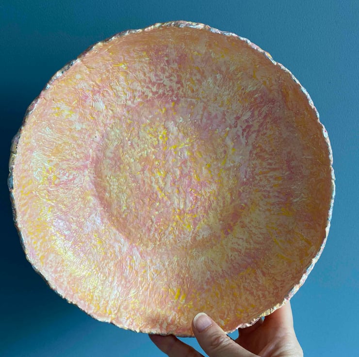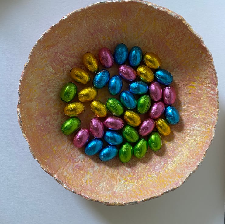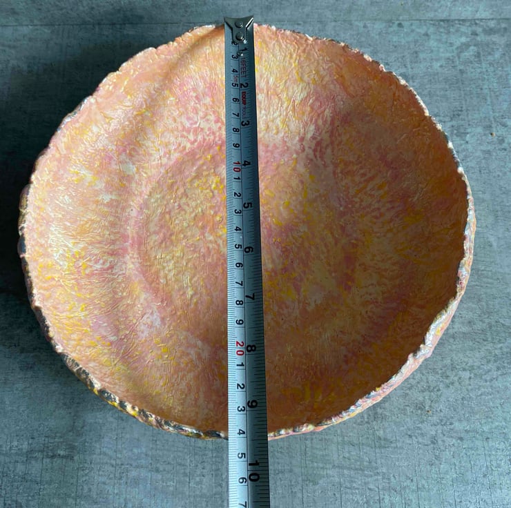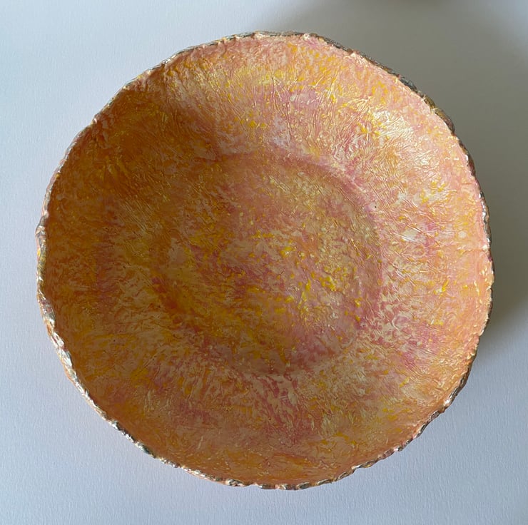 This gorgeous bowl is made from recycled paper mache clay. I have painted with layers of gorgeous colour to enhance the texture and varnished for protection.