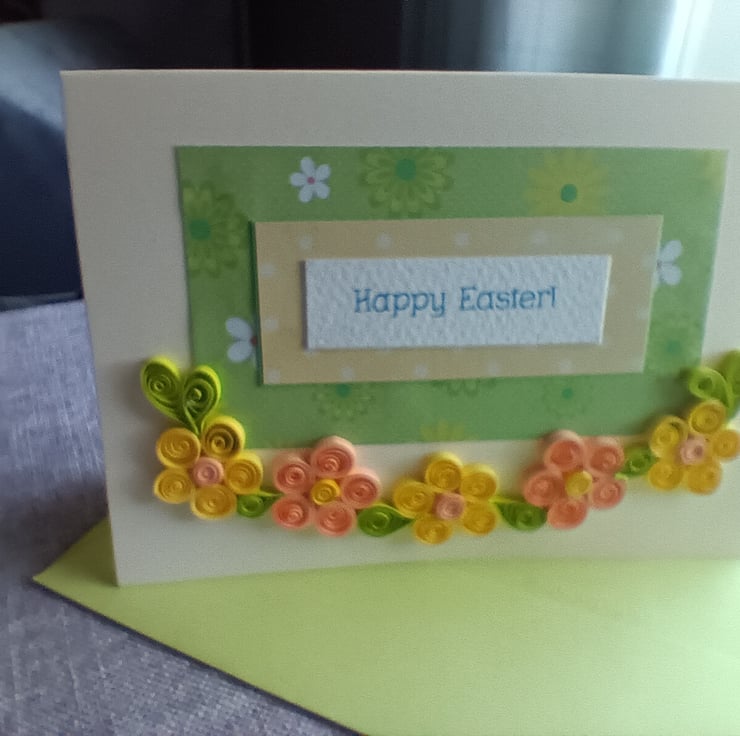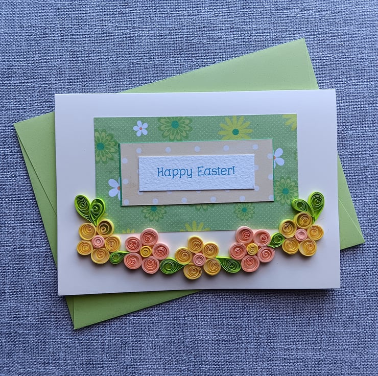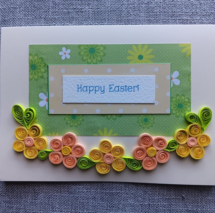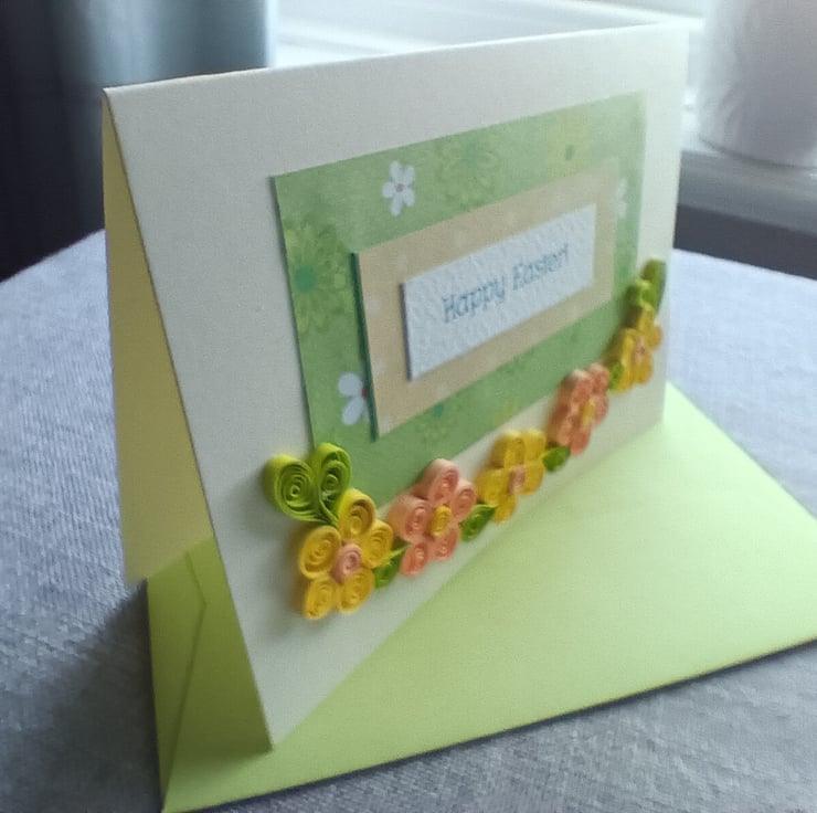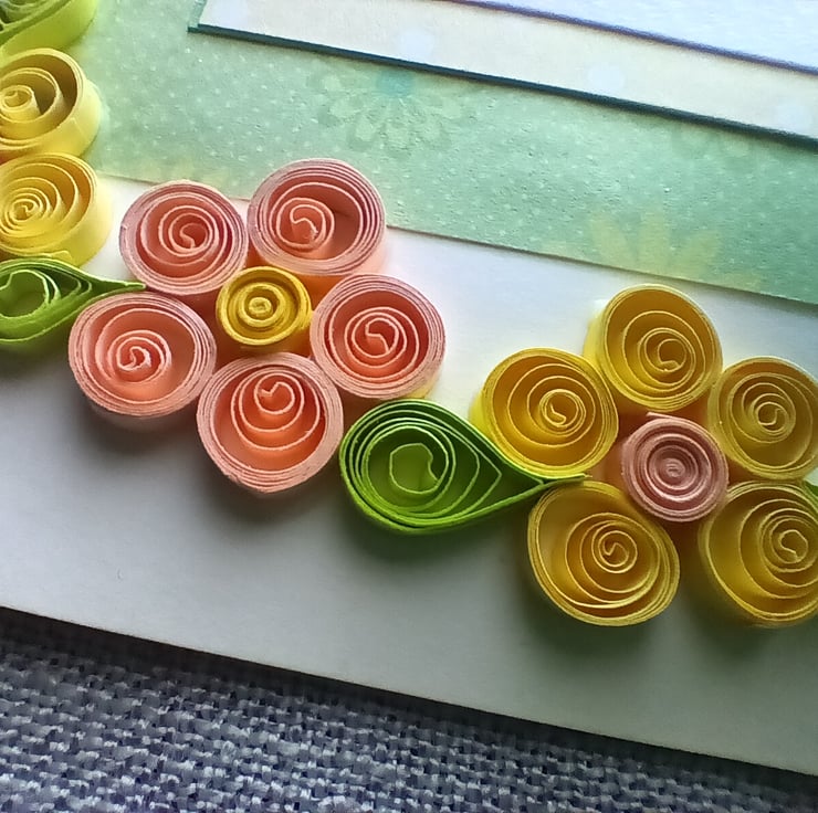 The card is made using a cream card and coloured/ patterned paper. The words are printed on quality paper. The flowers are made using quilling 3mm paper strips (green, yellow and pale apricot). The card is left blank inside and comes with a green envelope.