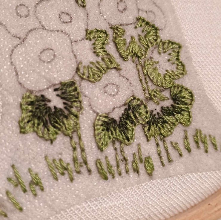 I have copied the pattern onto Stick and Stitch (soluble paper) meaning you don't need to trace or draw the pattern on to the fabric. Just stick it to the fabric and sew, then disolve and rinse it away in warm water at the end. The embroidery stitches used are Long-and-short, Blanket, French Knots and Split Stitch. Full instructions are provided, including how to mount/frame your picture.