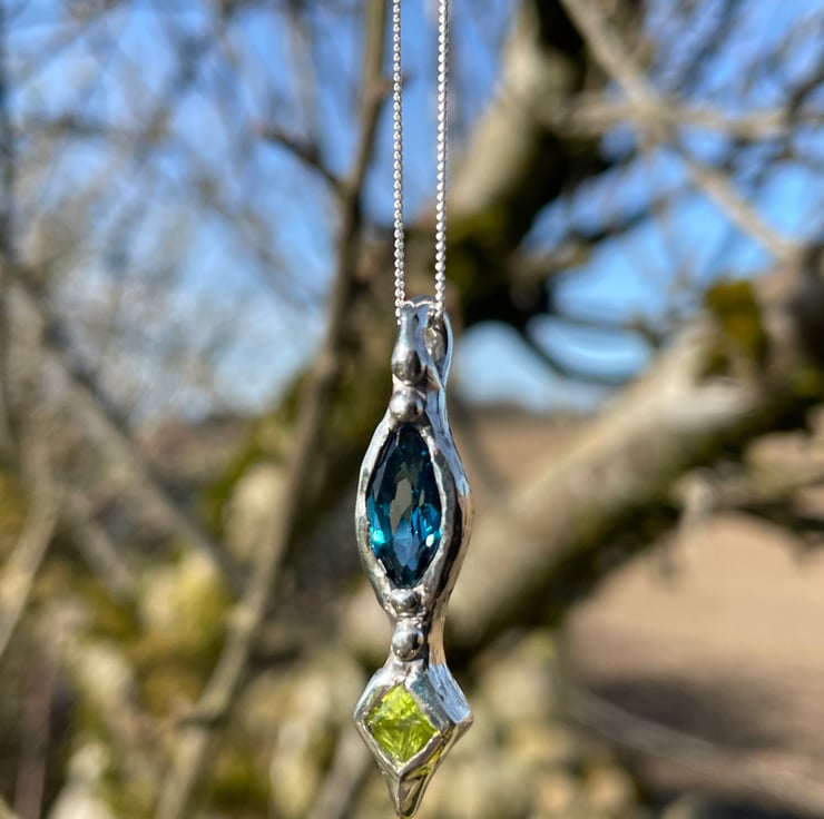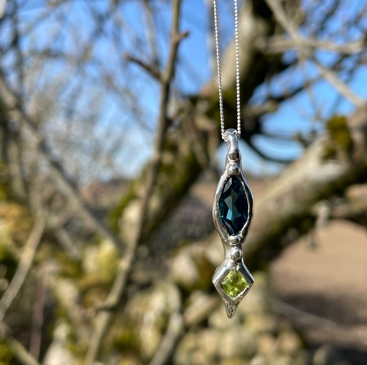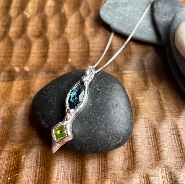 I wanted to pair two of my favourite stones together in one pendant. I picked two of my best stones out of my collection of topaz and peridot. Blue and green go so well together especially when set in silver.