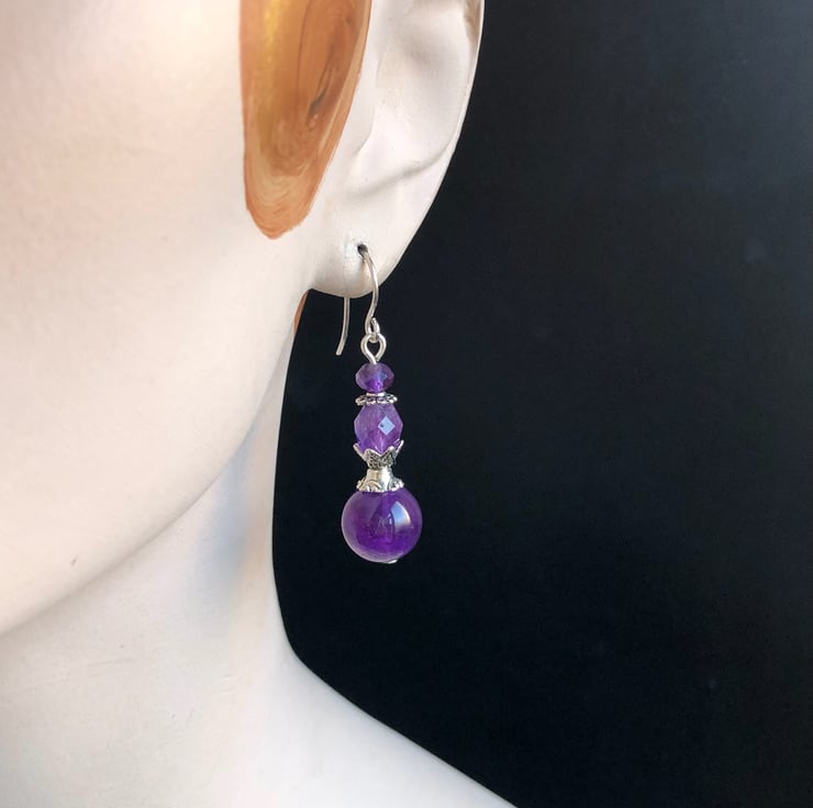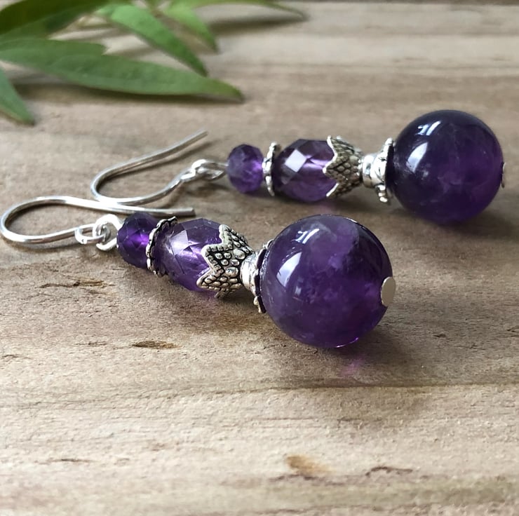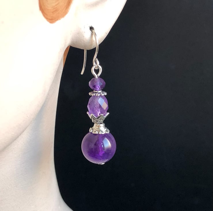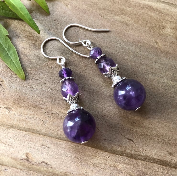 Boho vintage style dangle earrings with AAA quality purple Amethyst gemstone beads in a teardrop stack.