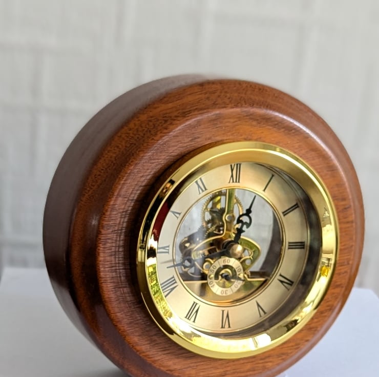 A bespoke turned clock of approximately 6 inches (150mm) in diameter and 2.5 inches (65mm) depth and 4 inch (103mm) clock face. Made from Mahogany wood and a Gold coloured clock face. Each clock is a one of a kind. Battery operated (battery not included for safety reasons). Other clocks in this style with different wood and silver clock available, please see other listings.