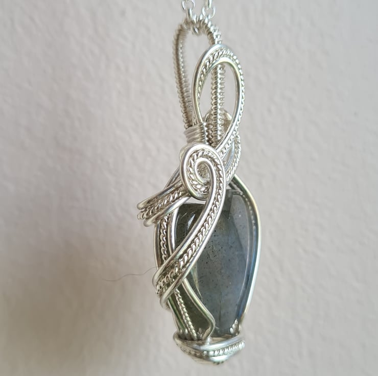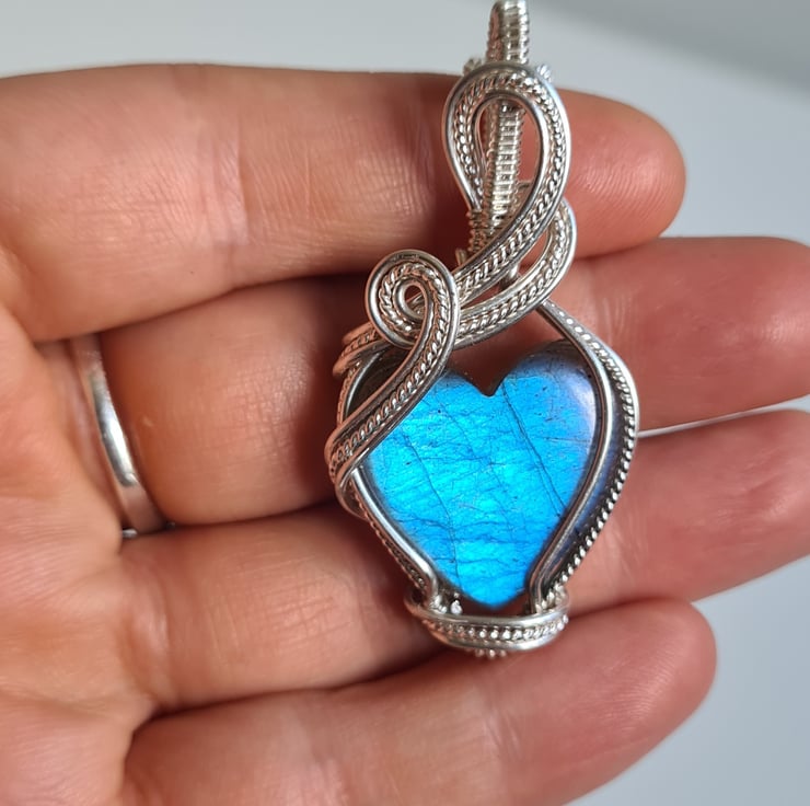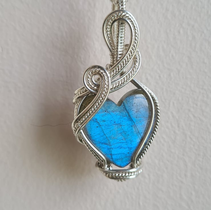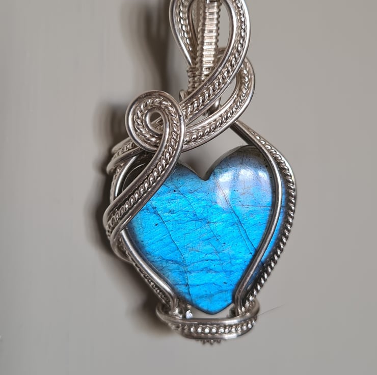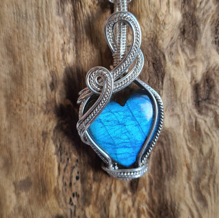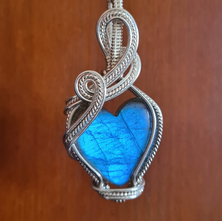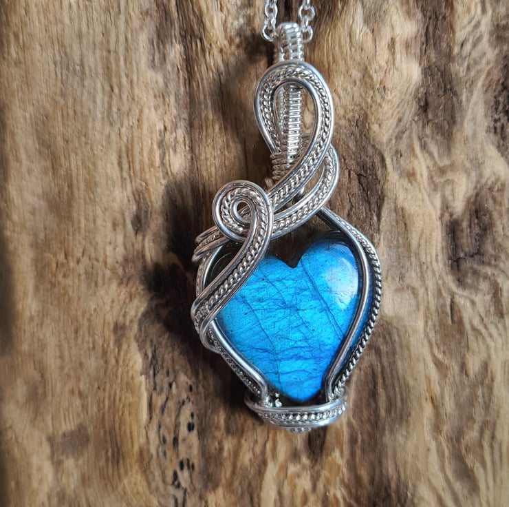 I have taken this very pretty Natural Labradorite heart crystal and I have wrapped it in 925 Silver to create this lovely elegant design. This stone has such a beautiful tone of blue and looks beautiful teamed with the silver and it's a very calming crystal with a beautiful flash of colour