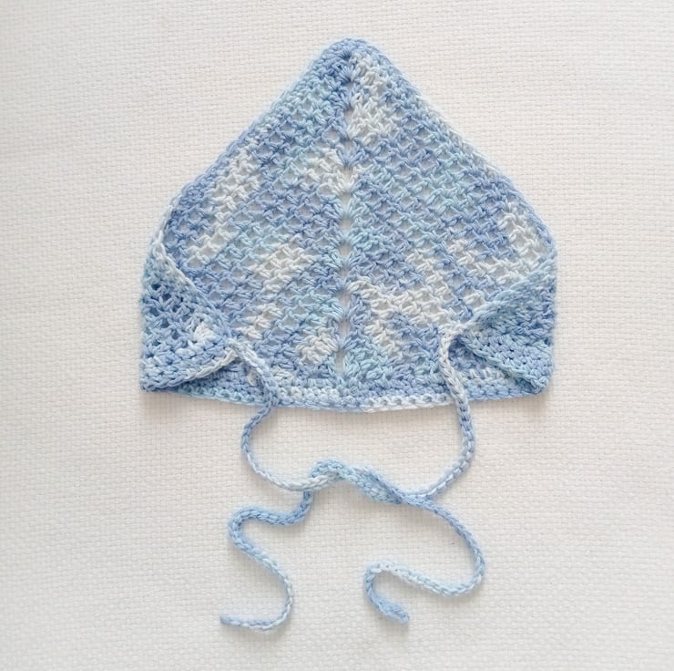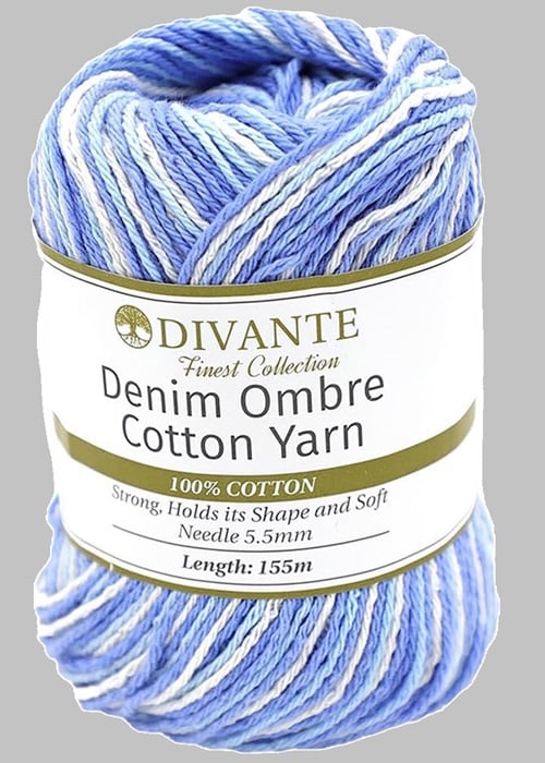 The bandana is made with Divante Denim Ombre Cotton Double Knitting using a 5 mm (H) crochet hook. The bandana is for an adult or child. The bandana measures 16 inches by 8 inches or 40 cm by 20 cm excluding the ties.