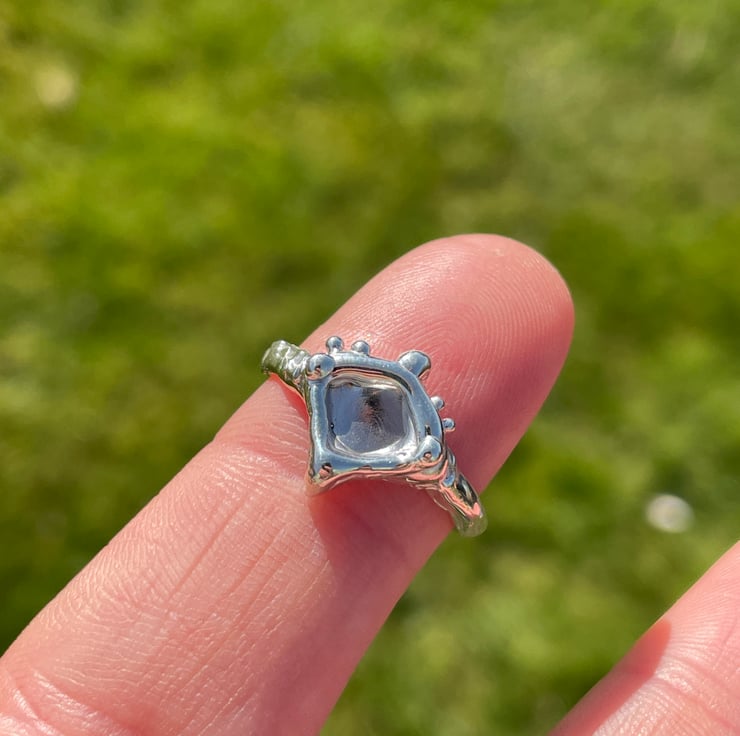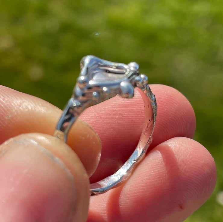 I made this ring in wax before it was cast! The wax process allows me to create little details like the one on this ring. The band is also textured.