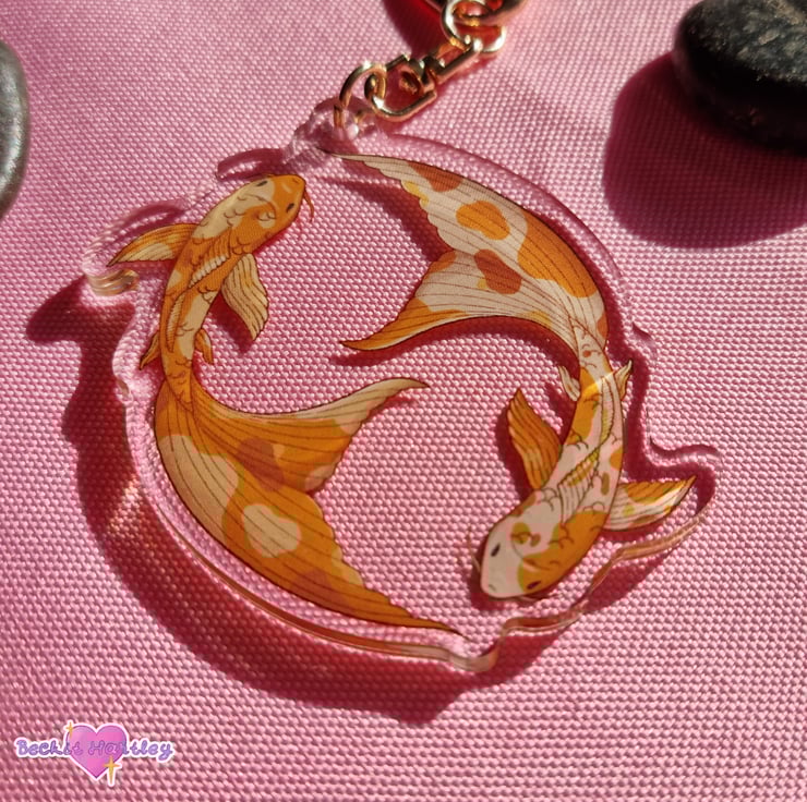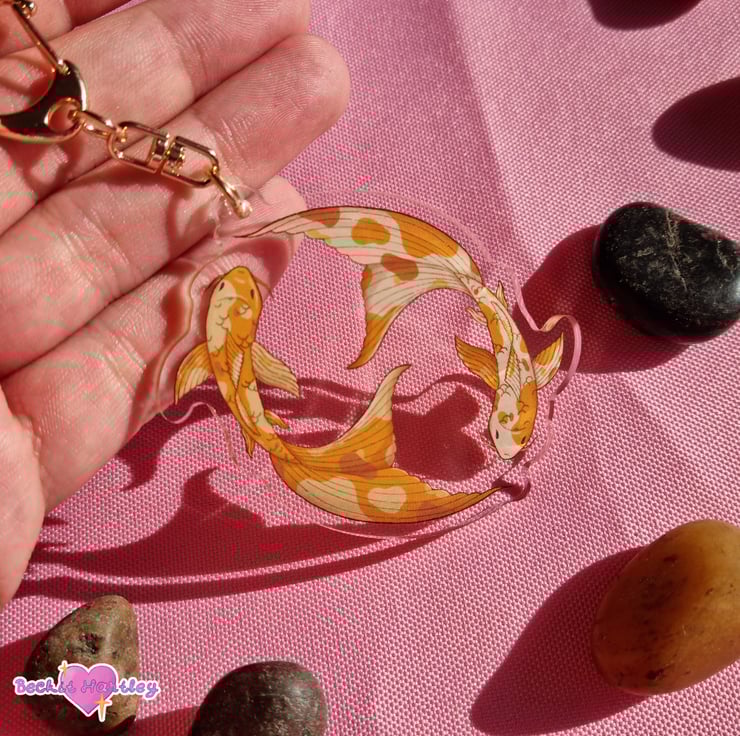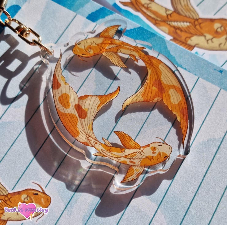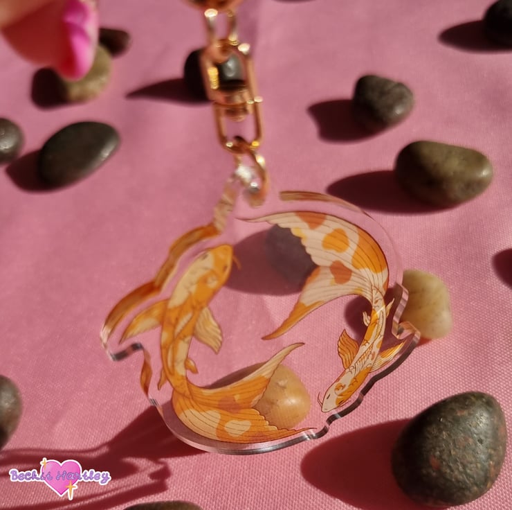 Featuring original illustrations of the koi carp from your secret garden, swimming together in harmony, a gold D hook clasp and approximately 6.5cm x 5cm in size, this keychain is the perfect accessory.