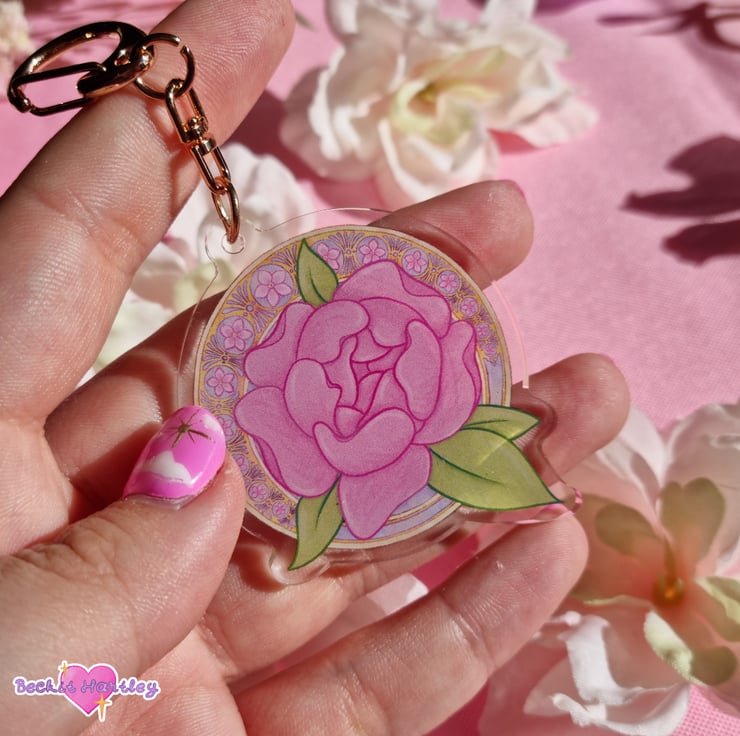 Featuring original illustrations of an elegant spring rose in an art nouveau style, a gold D hook clasp and approximately 6cm x 5cm in size, this keychain is the perfect accessory.