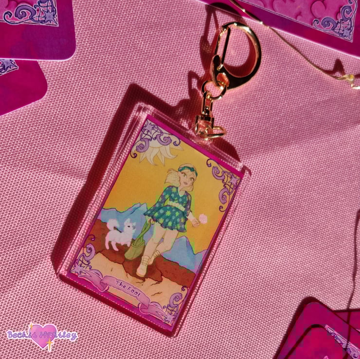 Featuring an original illustration of The Fool tarot card, inspired by the Rider-Waite deck, a gold D hook clasp and approximately 6cm x 4cm in size, this keychain is the perfect accessory.