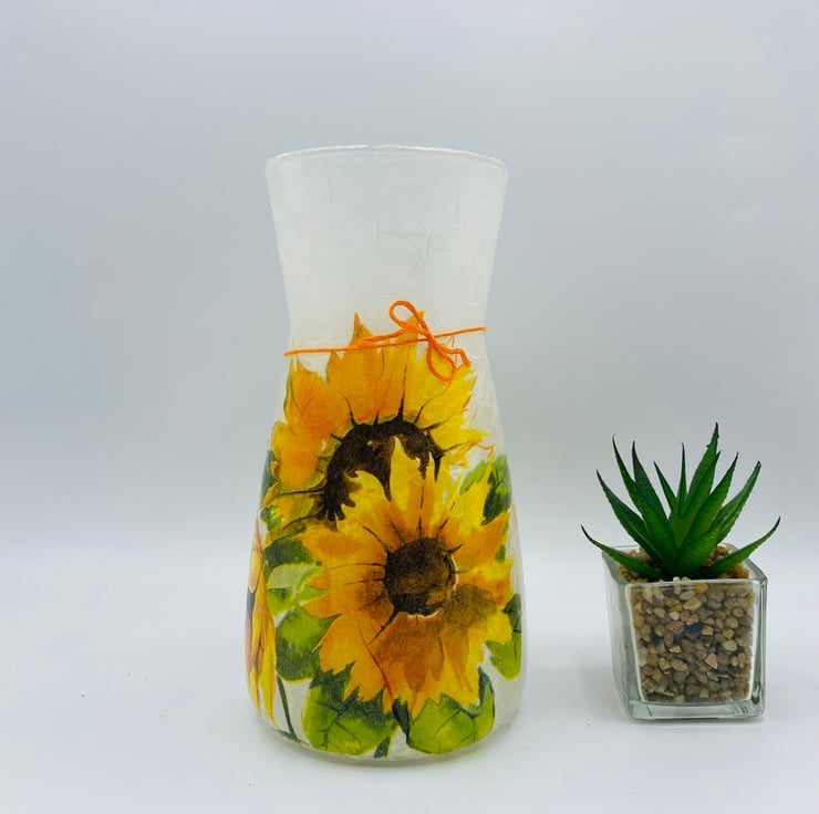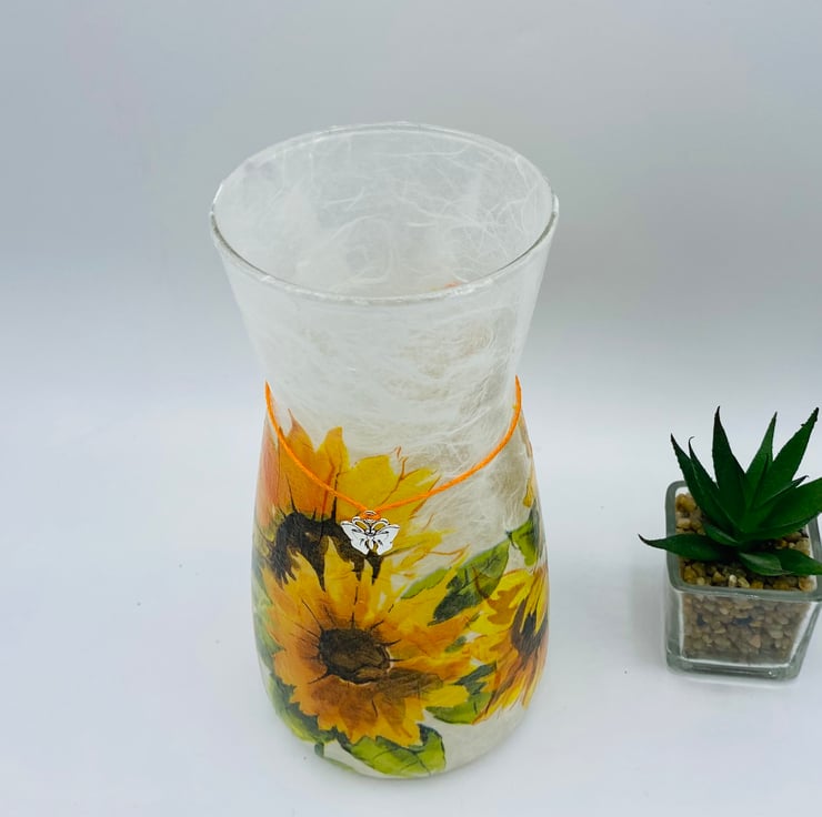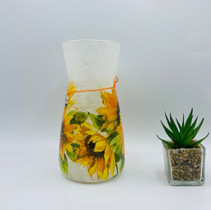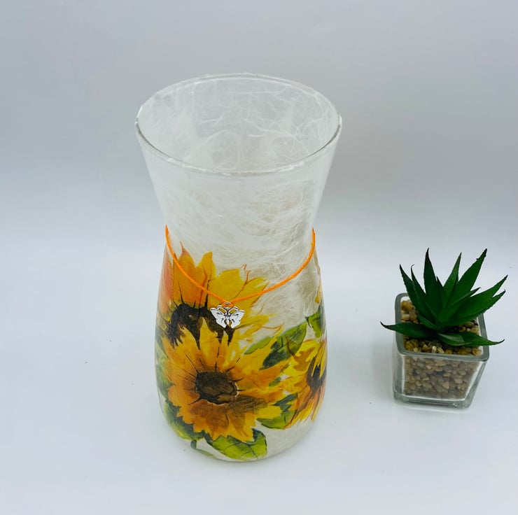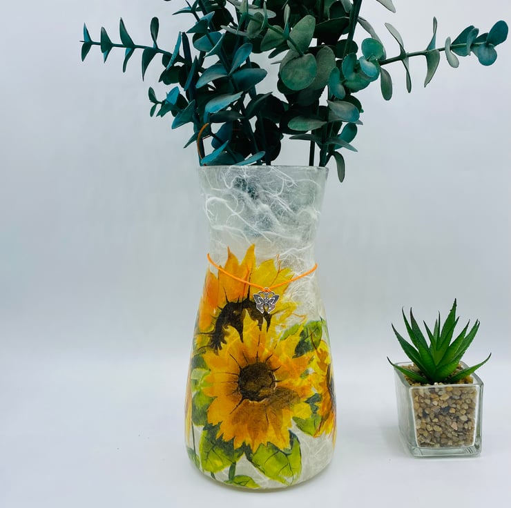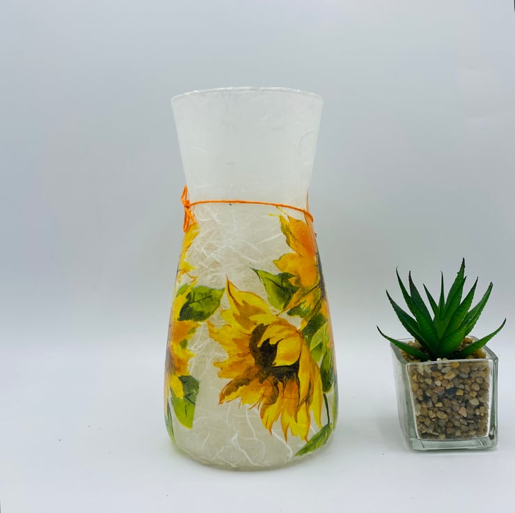 This beautifull vase has been carefully decoupaged with mulberry paper with a sunflower design.. The design, adds a unique, handcrafted quality to each piece.