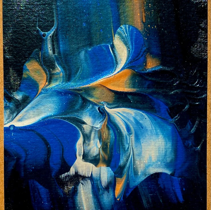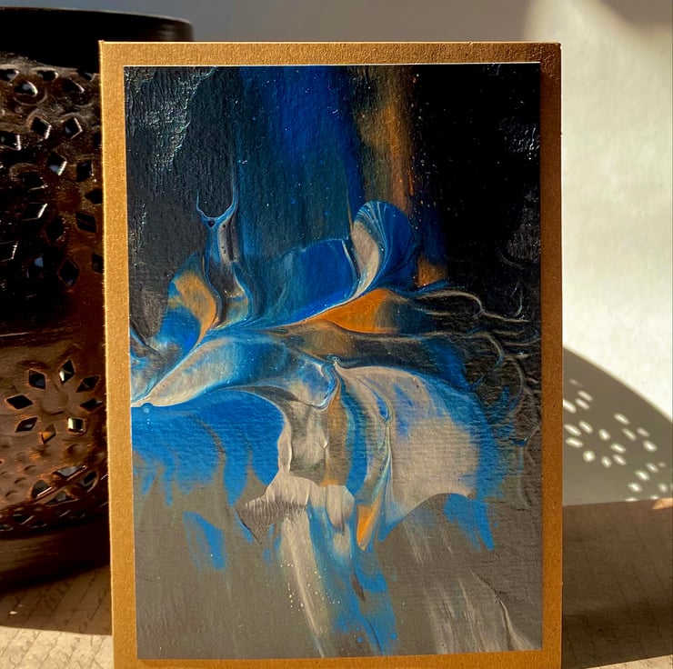 Abstract acrylic paint pour on watercolour paper. Blank inside for your own personal message. Beautiful blue with metallic copper and silver on a black background. Mounted on high-quality grade A6 300gsm brown kraft card. Eco friendly, acid and lignin free. Made from recycled kraft paper 105 x 148 millimetres with brown envelope. Packed in cello bag and delivered in ‘Do not bend’ hard board back envelope.