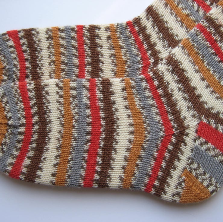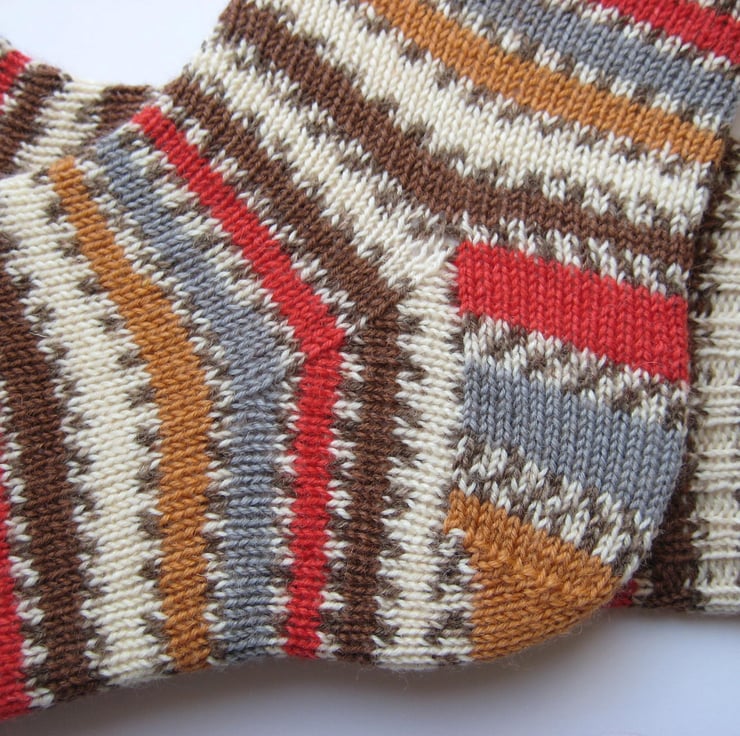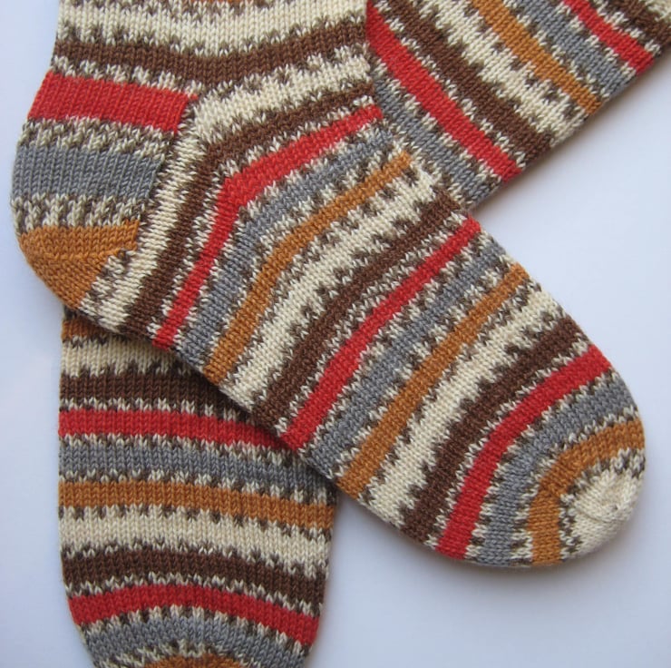 Hand knitted matching wool socks made from 4 ply self patterning sock yarn, 75% wool 25% polyamide in stripes of red, brown, orange and cream. Made from very fine yarn, they are not too thick and will fit most footwear. Warm and durable, these socks will keep your feet comfortable and bright throughout the year.