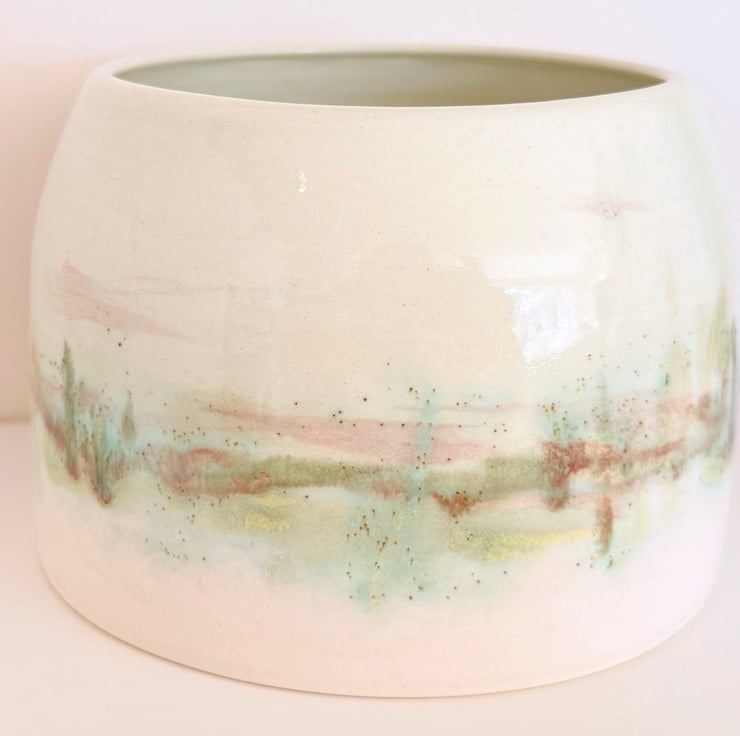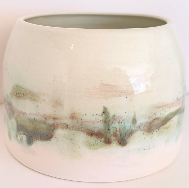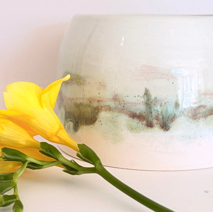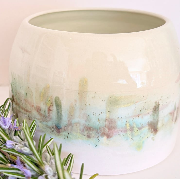 My ceramics are inspired by the countryside in Norfolk where I live. I glaze each piece individually by hand and so once the kiln works its magic, each item is unique. This planter has been thrown on the wheel and glazed in a painterly watercolour style by hand in shades of blue and green