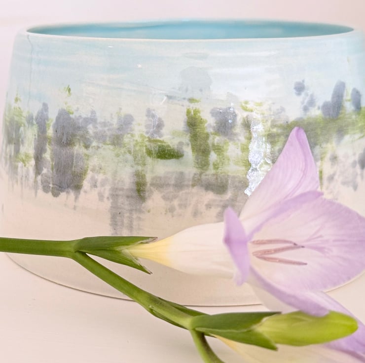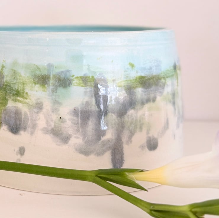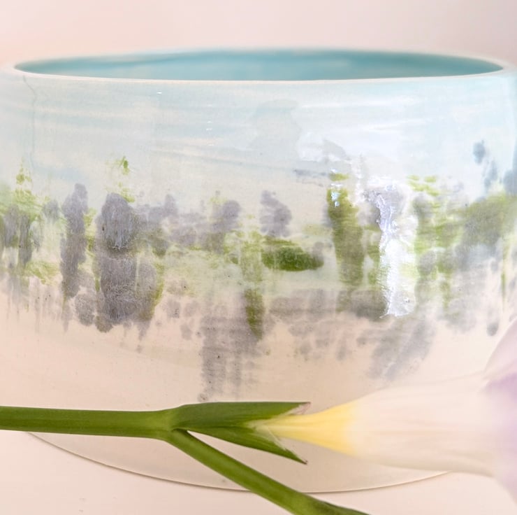 I glaze each of my pieces individually by hand and so once the kiln works its magic, each item is unique. My ceramics are inspired by the countryside in Norfolk where I live & this planter has been thrown on the wheel and glazed in a painterly watercolour style by hand in shades of blue and green