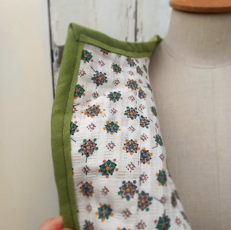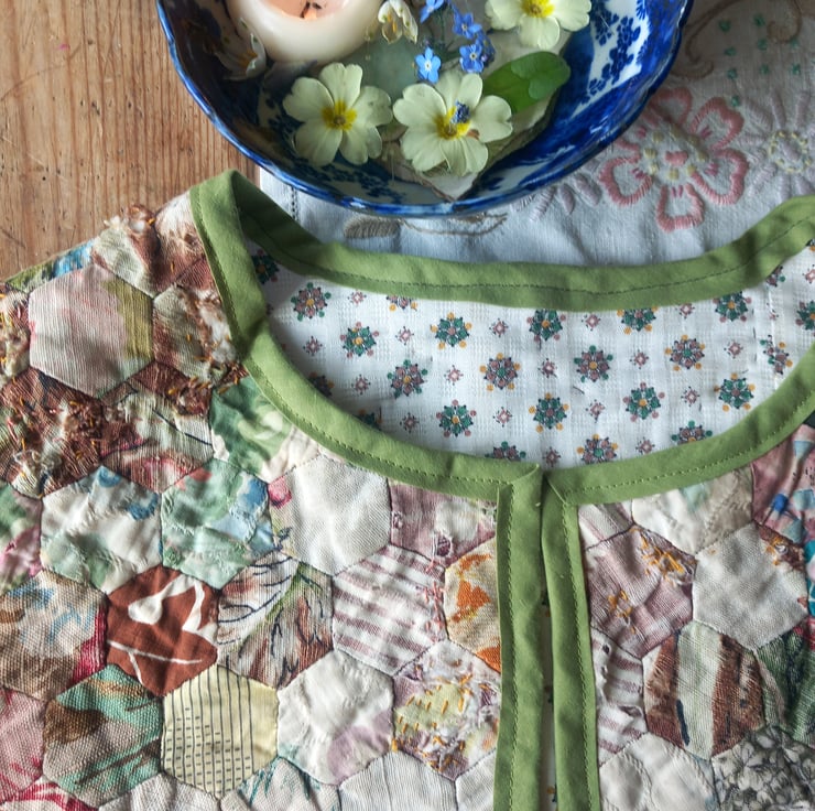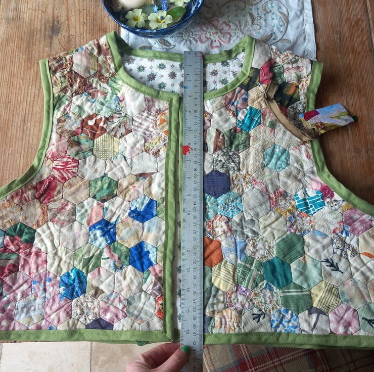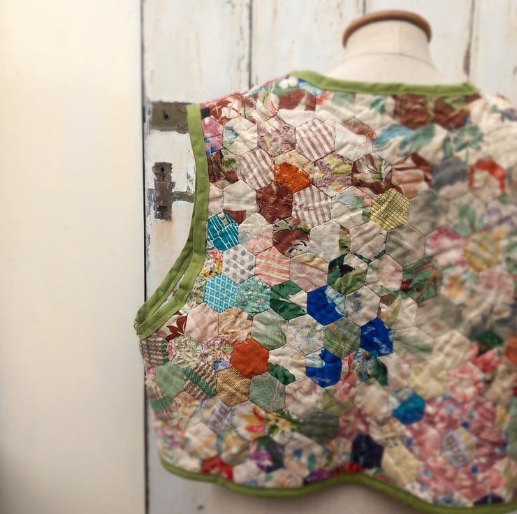 This has beautiful fabric in its packwork. A size 12 average. One off hand made with care , lined waist coat. Gor s lover of textiles and clothing that is a work of art. I have done slow stitching over any worn bits. It truly delightful.
