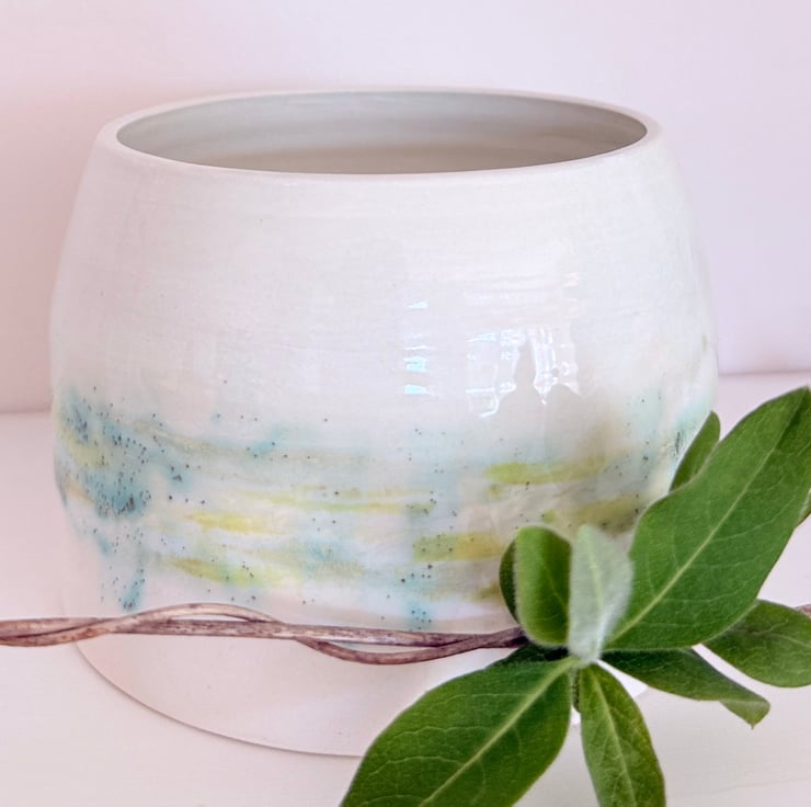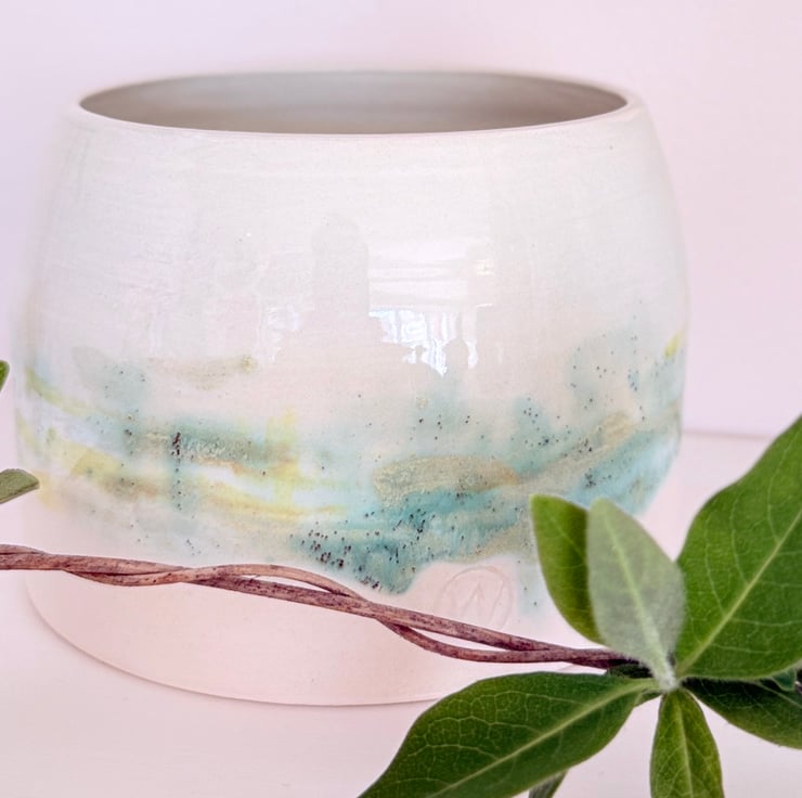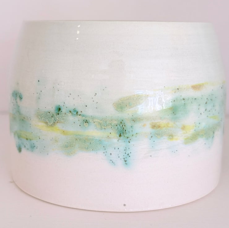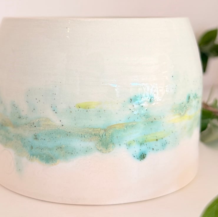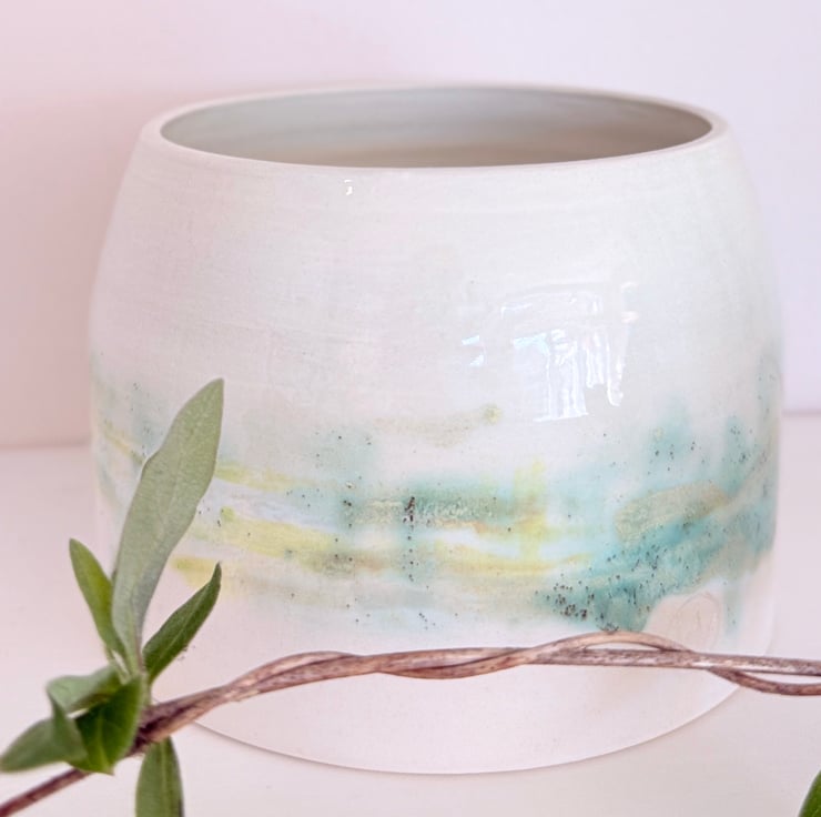 My ceramics are inspired by the countryside in Norfolk where I live & this planter has been thrown on the wheel and glazed in a painterly watercolour style by hand in shades of blue and green.