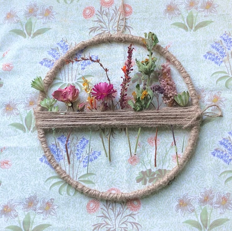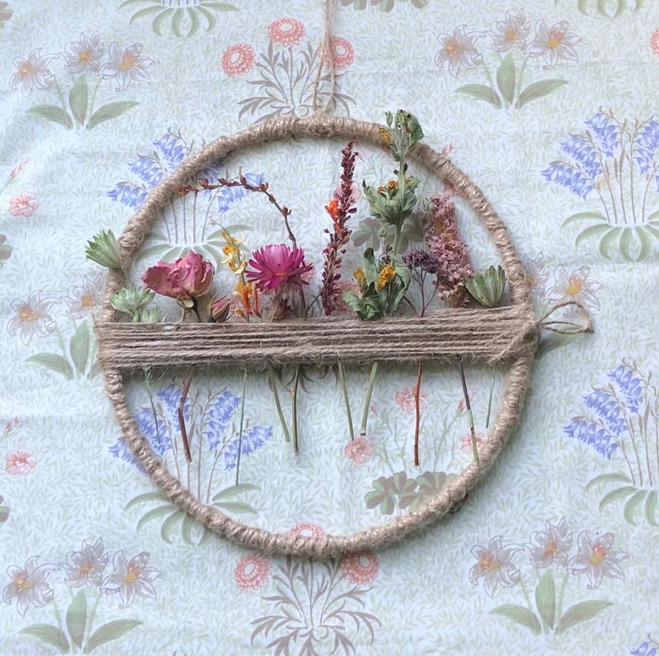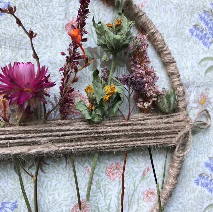 Floral dried flower hoop measuring approximately 20cm in diameter.
