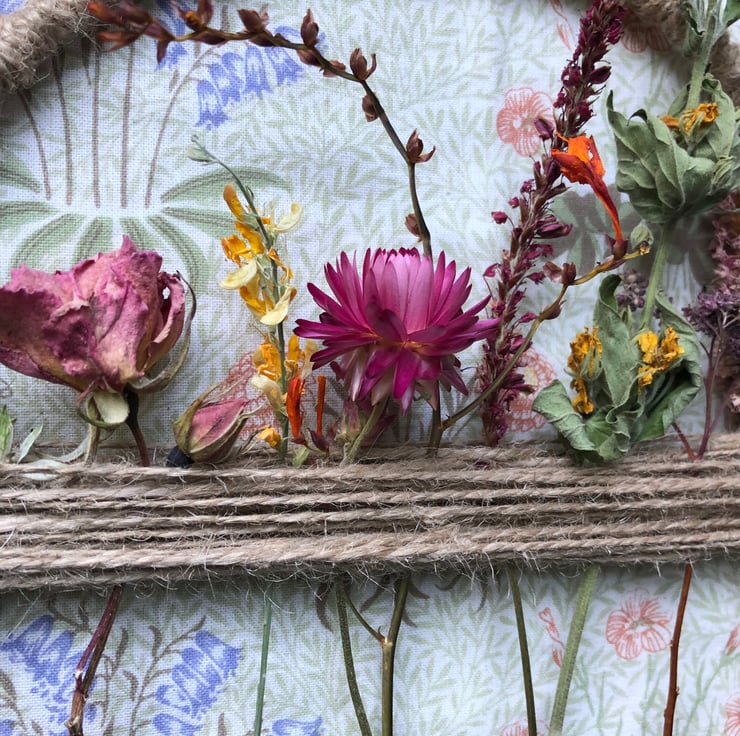 The hoop is metal and has been wrapped in twine. The dried flowers have been woven into the horizontal strip of twine in the middle of the hoop. No glue has been used.