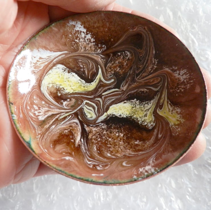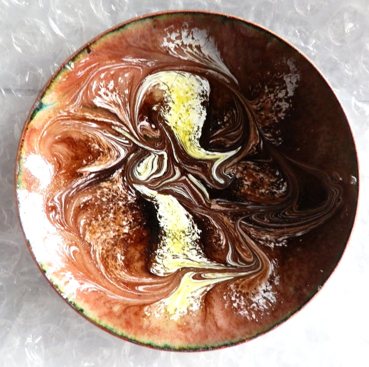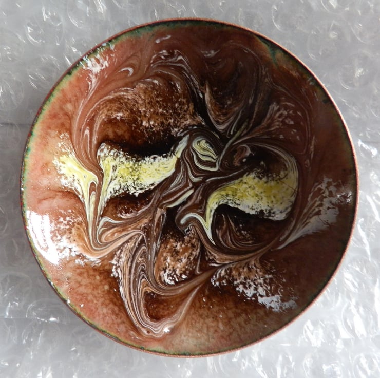This is a copper bowl decorated with glass enamel. The random pattern I have managed to generate suggests to me freshly stirred coffee with cream..