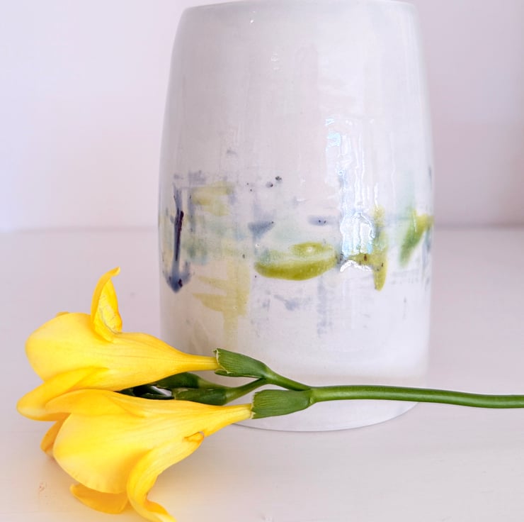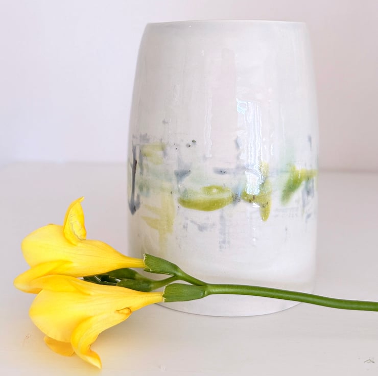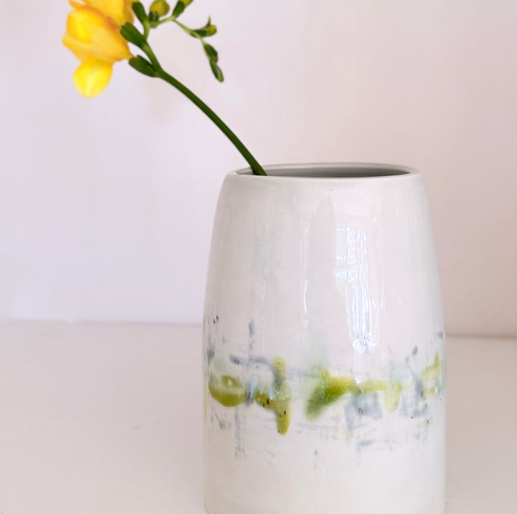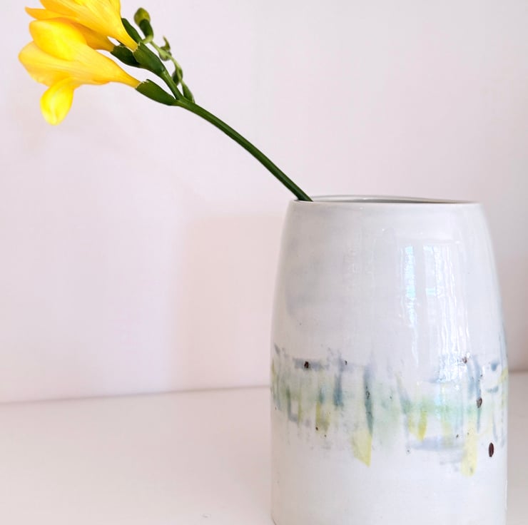 Green and blue hand-glazed vase- I am heavily influenced by the countryside in Norfolk where I live and use the colours in the countryside to inspire my glazing. This vase looks lovely with contrasting foliage or with dried flowers and grasses.
