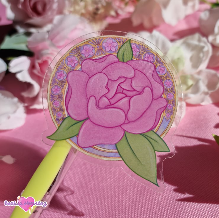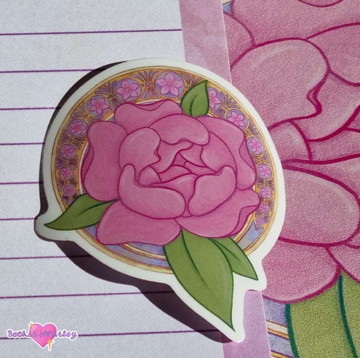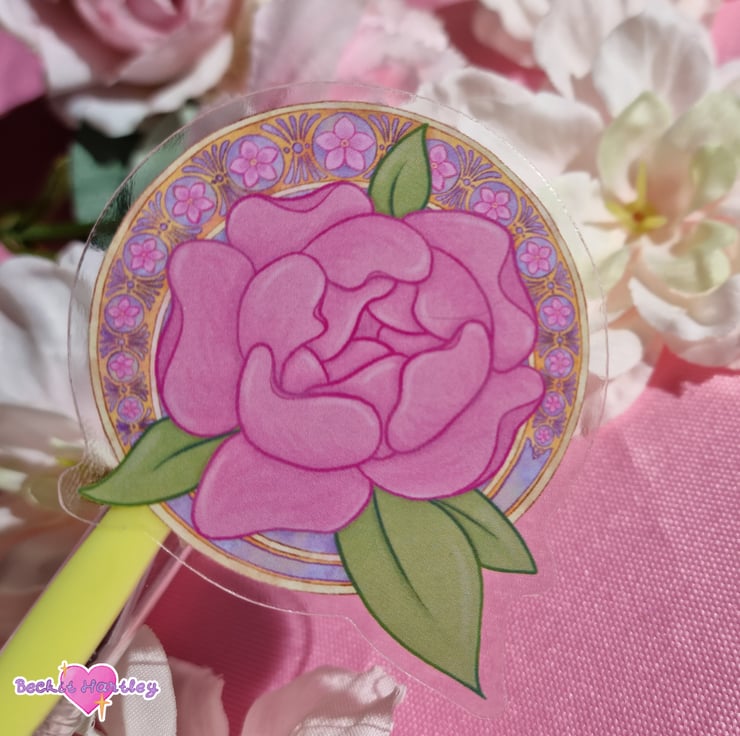 Featuring original illustrations of an elegant spring rose in an art nouveau style and approximately 6.5cm x 5.5cm in size, this clear sticker is a great way to decorate your cup, notebook or water bottle.