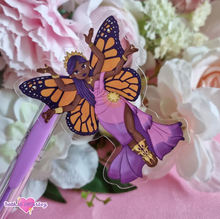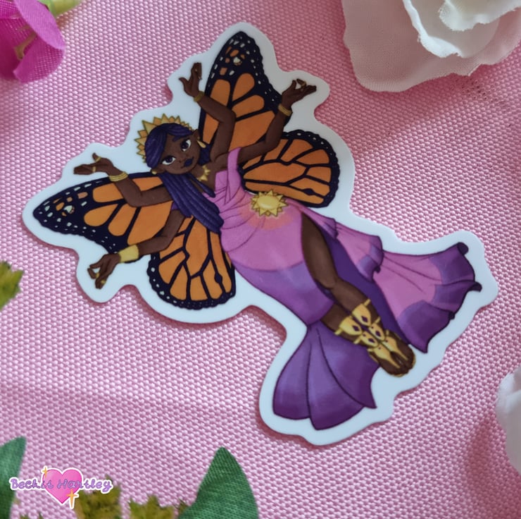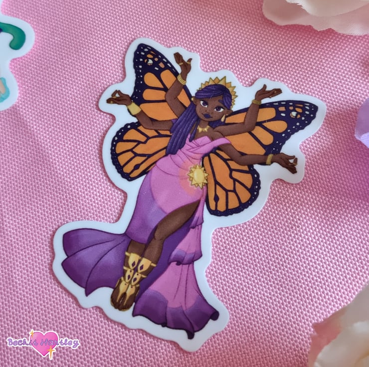 Featuring an original sun goddess illustration and approximately 6cm x 5cm in size, this clear sticker is a great way to decorate your cup, notebook or water bottle.