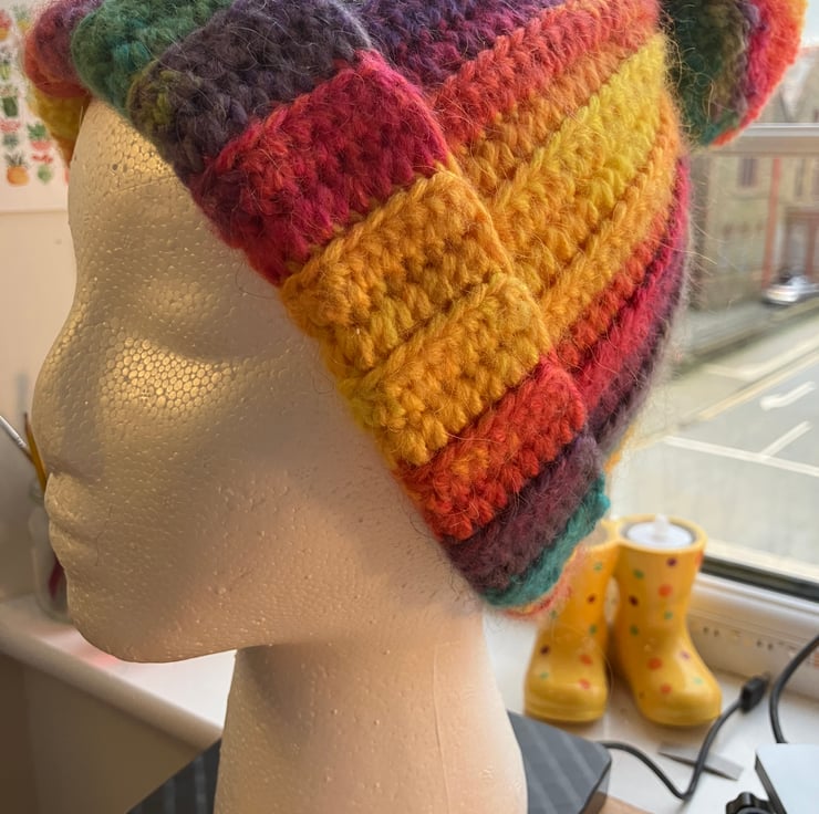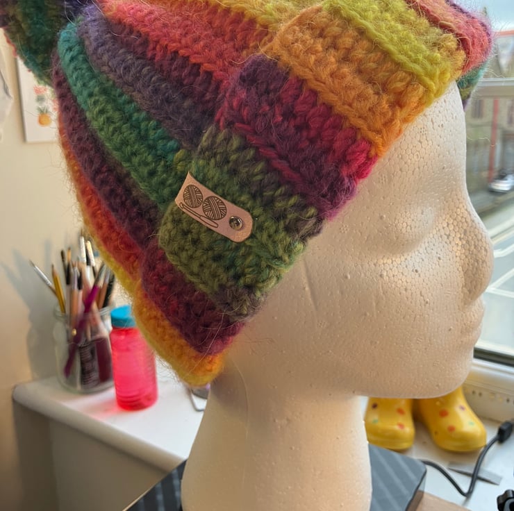A hand crocheted rainbow beanie with a Pompom.