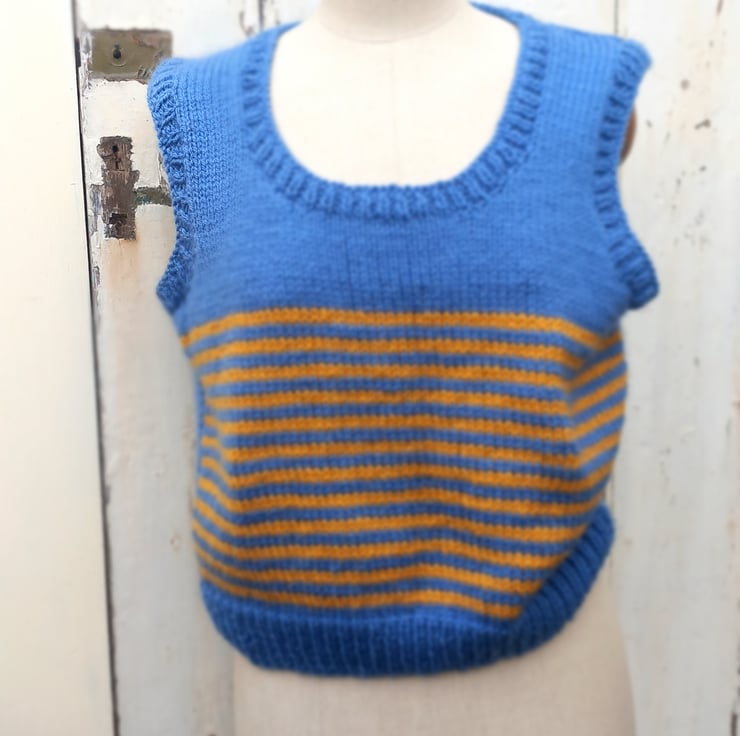 A beautifully knitted tank top medium. Has some acrylic so will hand wash well. Cute boxie shape. In bluecand mustard shades.