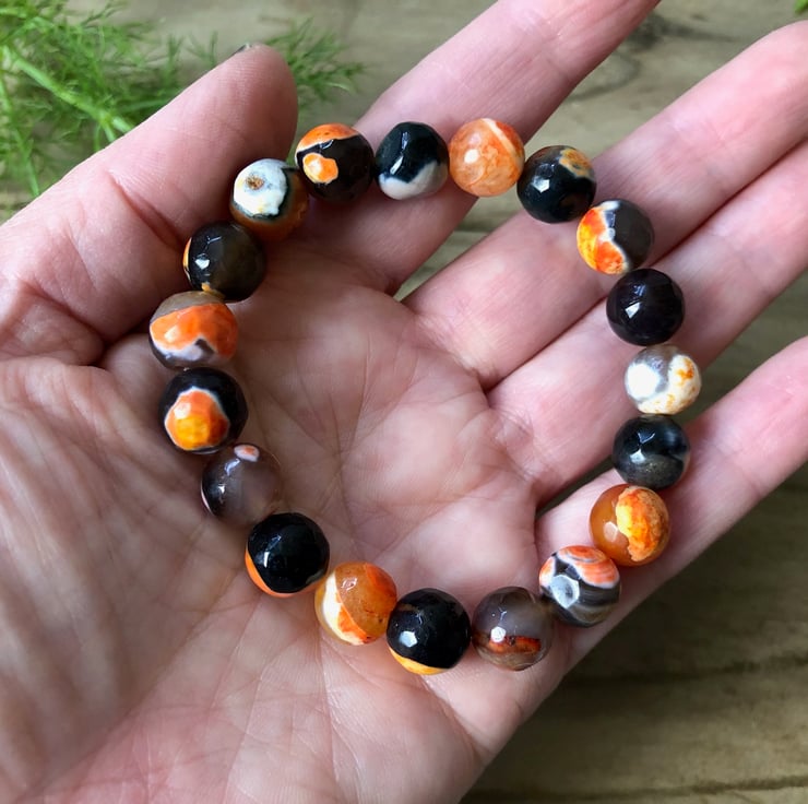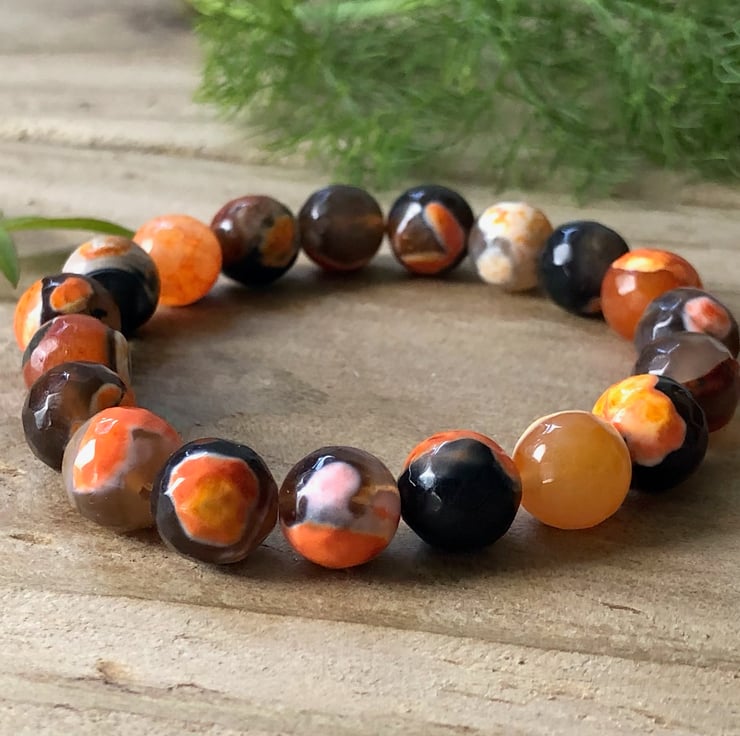 A custom made stretch bracelet with unusual 10mm black and orange natural dragon's vein fire agate gemstone beads.