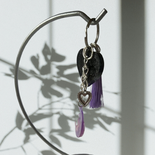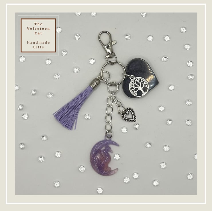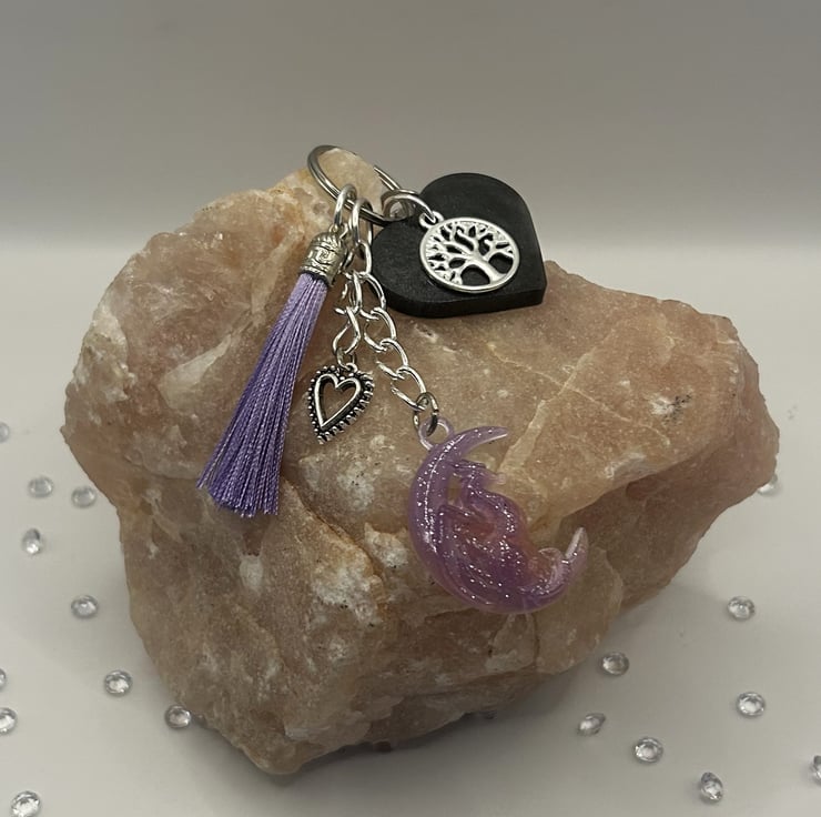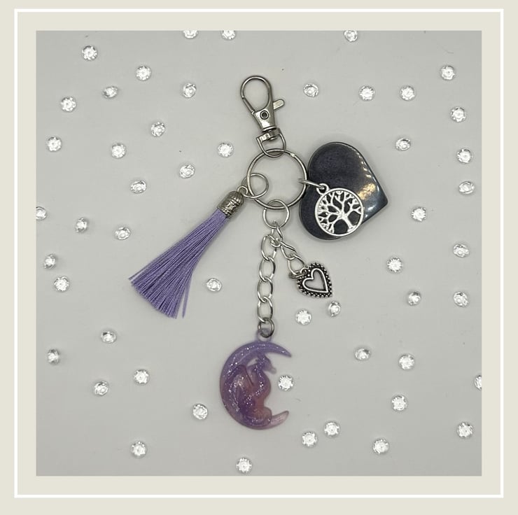 Crescent Moon Dragon Heart Resin Bag Charm, Keyring in Purple and Lilac Shades