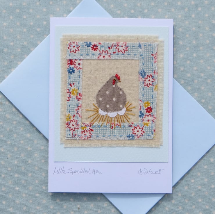This is a small hand-made greeting card featuring a miniature hand-stitched applique made with pretty cotton fabric with intricate embroidered details. It is entitled 'Little Speckled Hen' and is a gift in itself as well as a card in which to write your message - definitely a card to keep! (perfect for the new poultry keeper!)