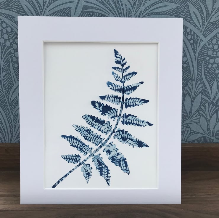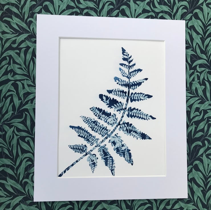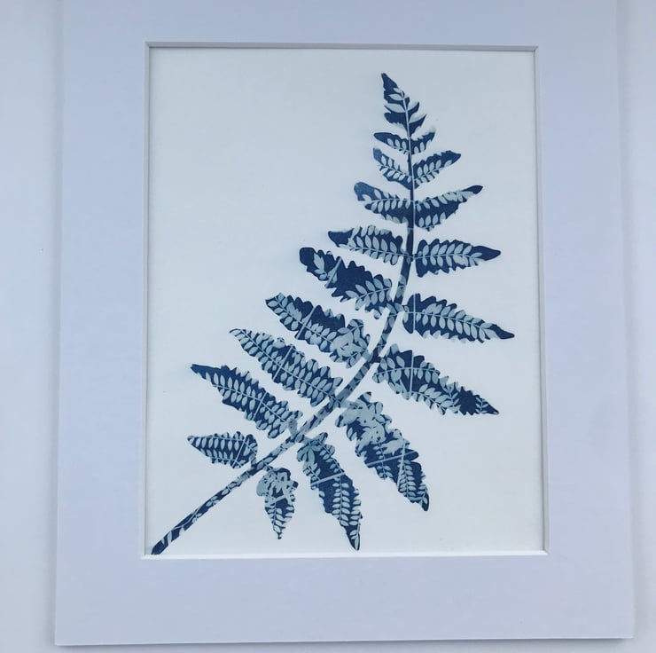 In this unusual Photogram, I painted the fern onto the paper with the light-sensitive solution used in Cyanotype to create the silhouette effect and laid the delicate pressed leaves of the Jacaranda plant on top, before exposing it to the Hampshire sunshine to develop. I think it creates a pretty effect and the shape seems to sweep across the paper. It can be hung either way up.