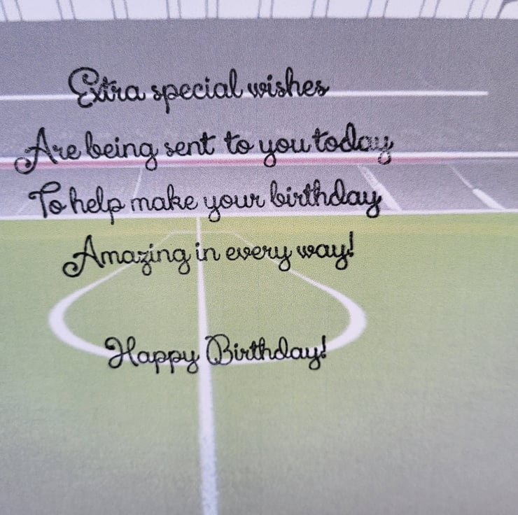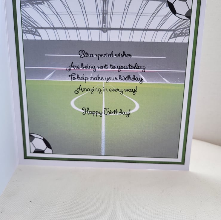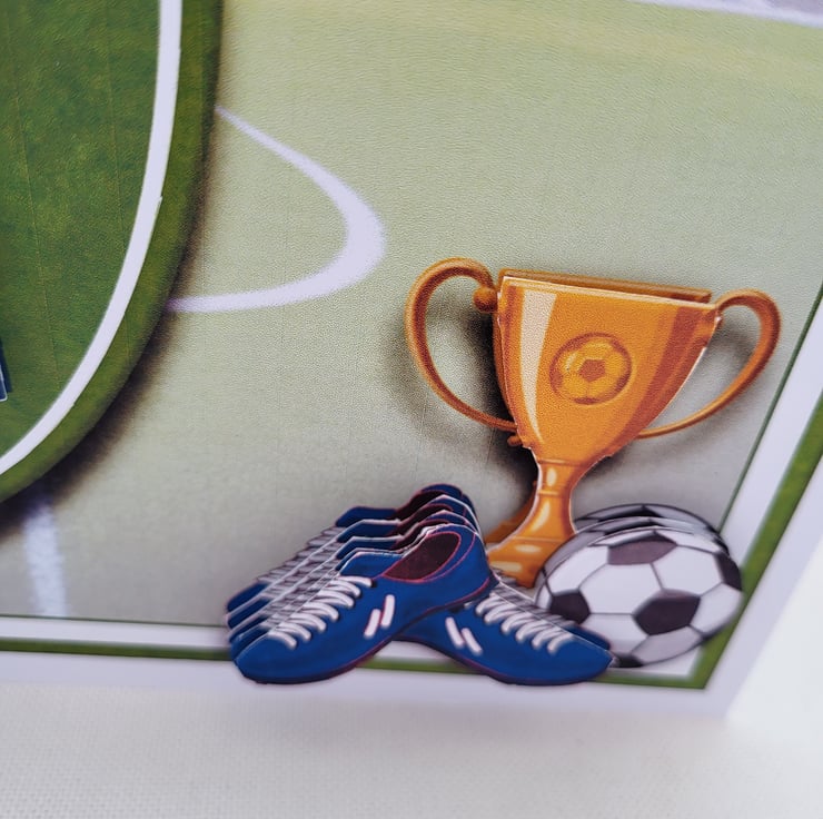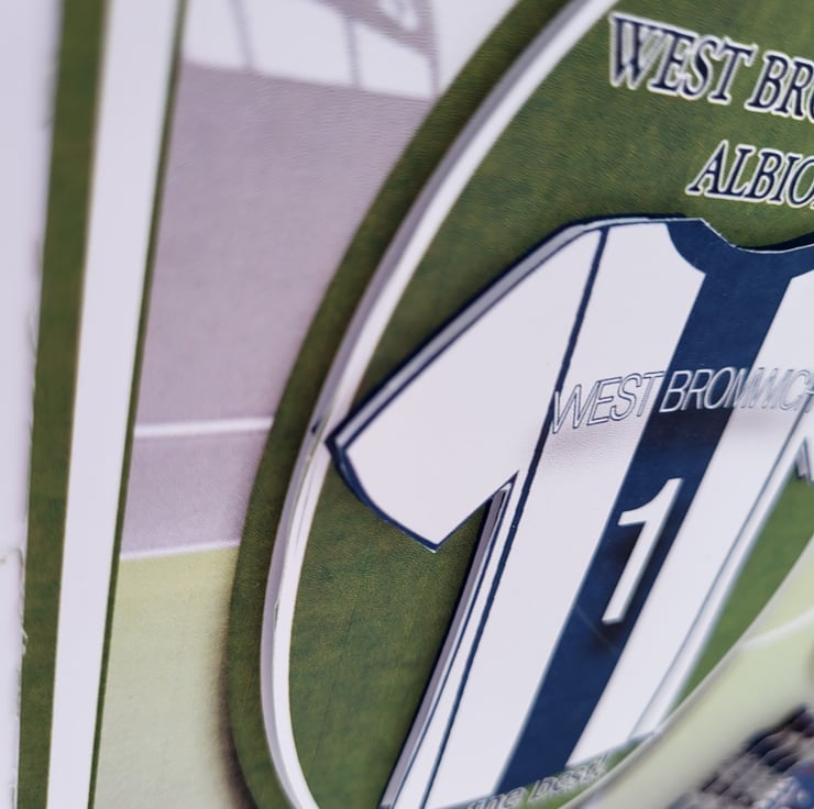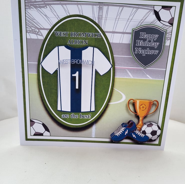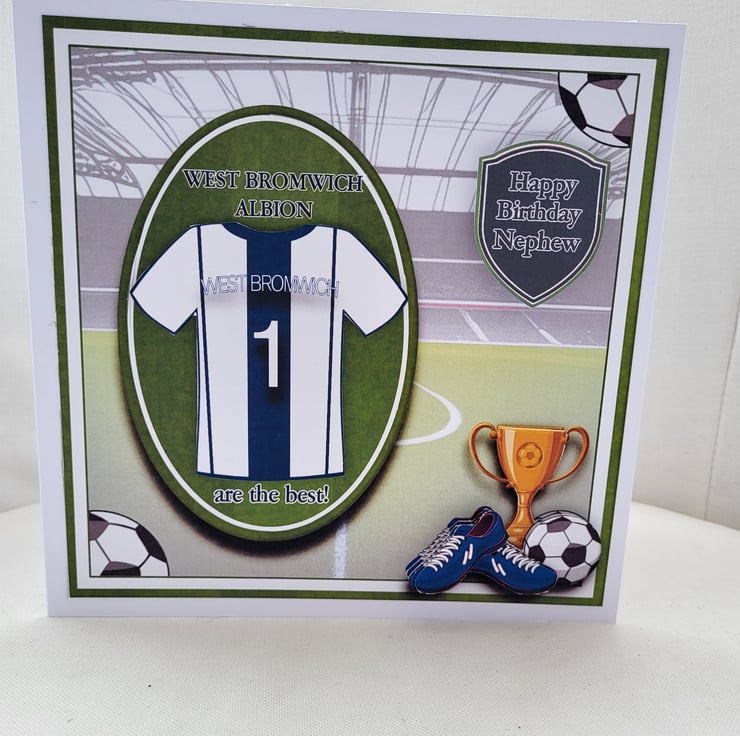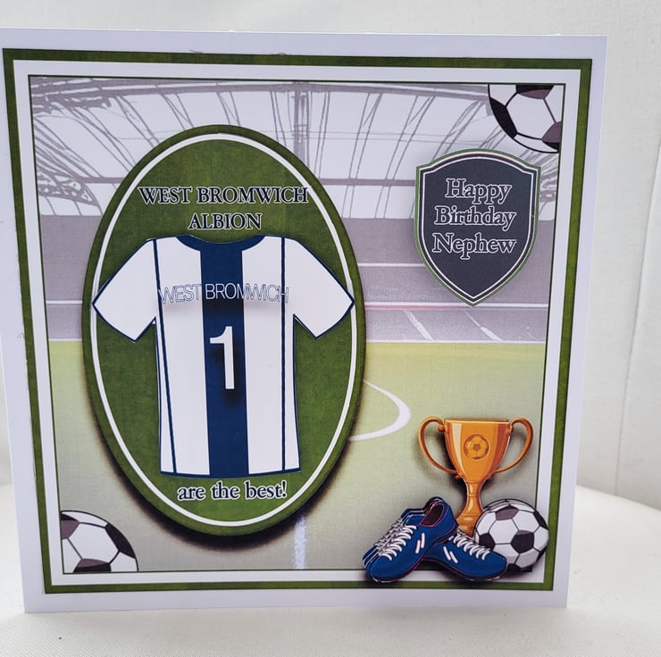 This is the perfect card for a West Bromwich Albion fan. It measures approx 8 x 8 inches. Each element has been hand cut then layered with foam tape to create texture and dimension. The inside of the card has been hand stamped with a birthday verse.