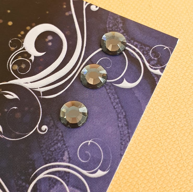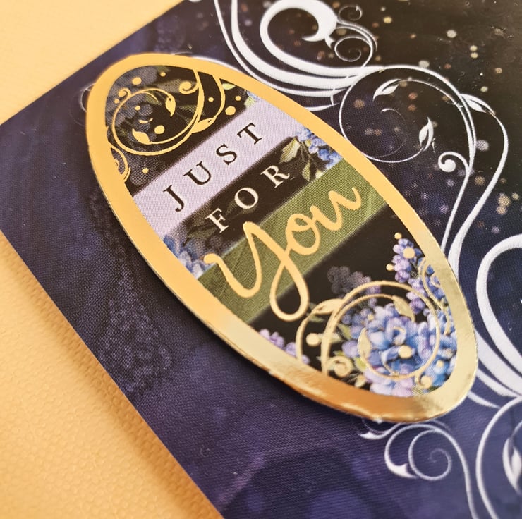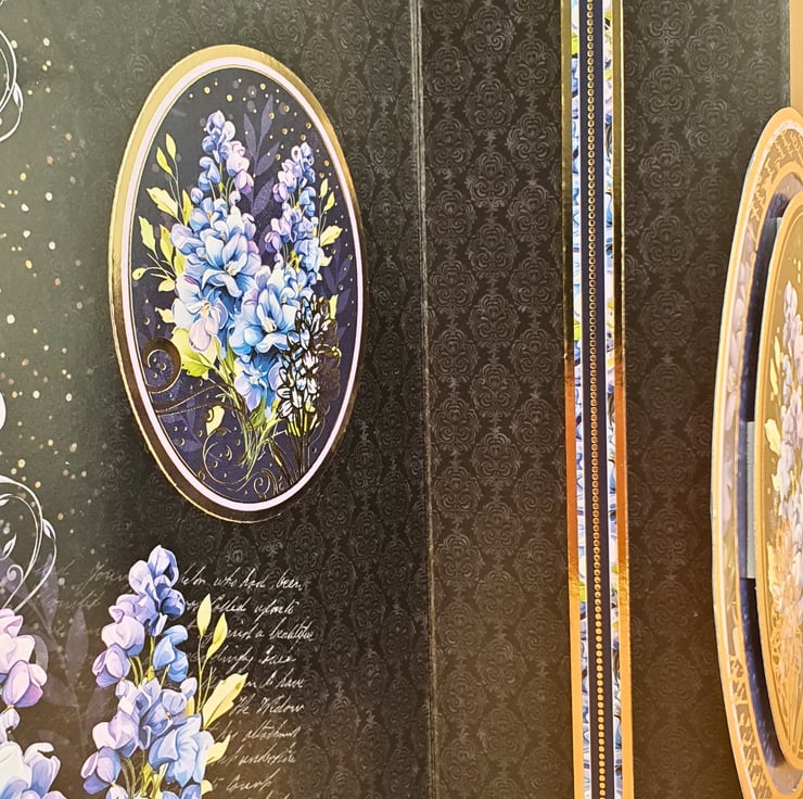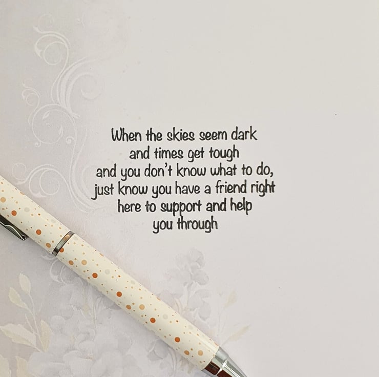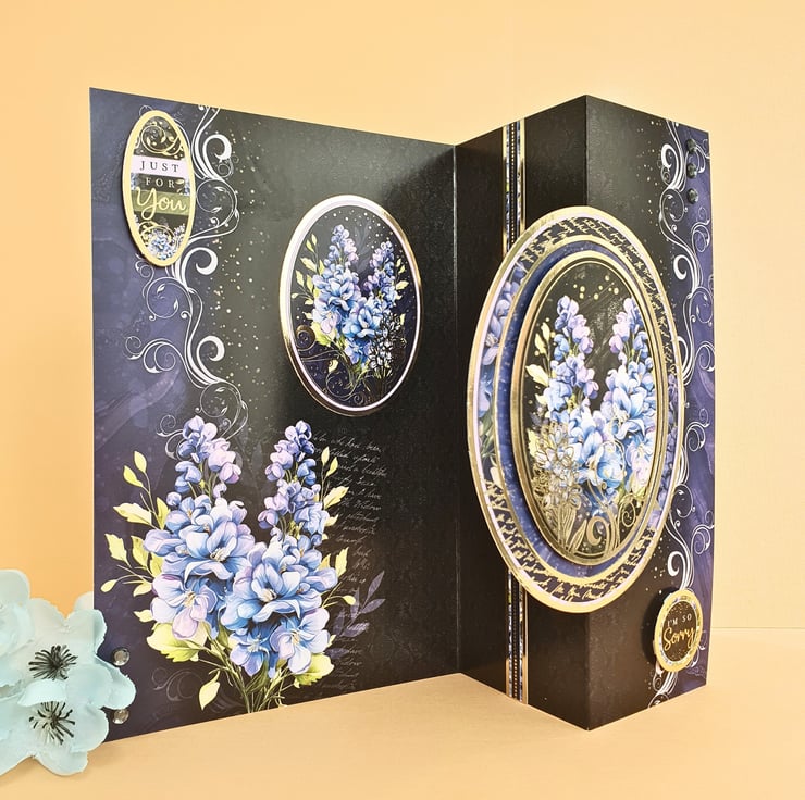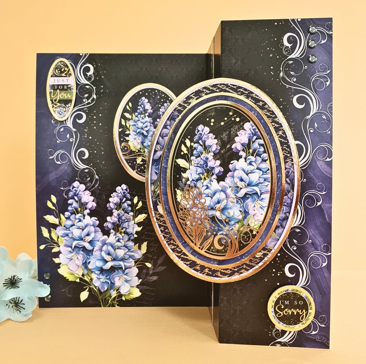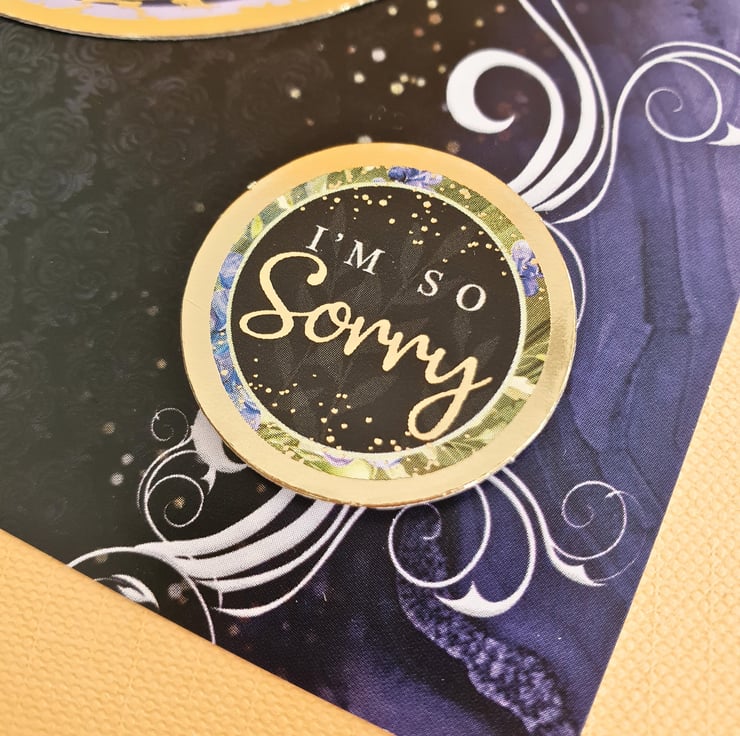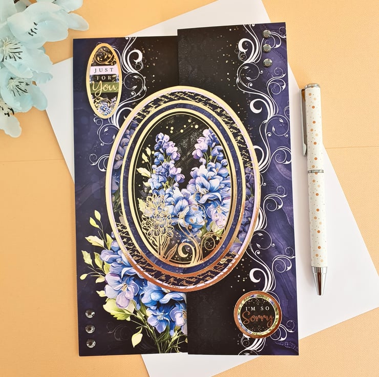 It consists of a luxury cardstock in purple & black, printed with decorative white swirls and Delphinium flowers. A large gold foiled topper with the same flowers decorates the front panel, accompanied by smaller matching toppers that read "Just For You" & "I'm So Sorry". The card is embellished with gemstones in black and it is finished with a matching insert at the back, that has been stamped with the message "When the skies seem dark, and the times get tough, and you don't know what to do, just know you have a friend right here, to support and help you through".
