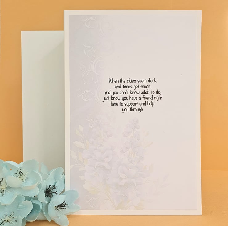 Handmade foldback greeting card, displaying purple Delphinium flowers, with a message of support & hope stamped on the insert. Perfect for expressing your sympathy to a loved one who is going under a tough time.