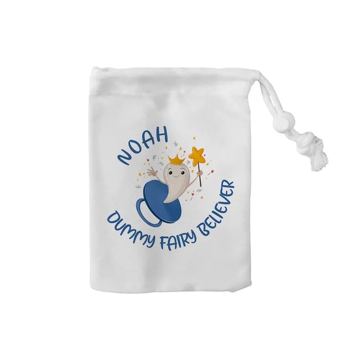 Make your child’s transition from dummies extra magical with this Personalised Dummy Bag for the Fairy! This adorable canvas drawstring bag is the perfect way to store dummies before sending them off to the fairies. Featuring a whimsical design with your child’s name (up to 12 characters) It’s both a practical solution and a cherished keepsake for this important milestone.Key Features:Personalised for Your Child: Add their name (up to 12 characters) for a unique and thoughtful touch.Premium Canvas Material: Made from high-quality canvas with a secure drawstring and stopper for durability.Perfect Keepsake: A delightful way to commemorate the Dummy Fairy tradition.Compact Size: Measures 15cm x 20cm—perfect for little hands and easy storage.Why It’s Special:This bag turns the transition from dummies into a magical and memorable experience. Whether as part of a bedtime ritual or a fun gift alongside the Dummy Fairy storybook, it’s a practical yet sentimental keepsake that kids and parents will treasure.What’s Included:1x Personalised Canvas Dummy BagHow to Order:Enter the child’s name (up to 12 characters) in the personalisation box.Add to basket and complete your order—we’ll handle the rest!