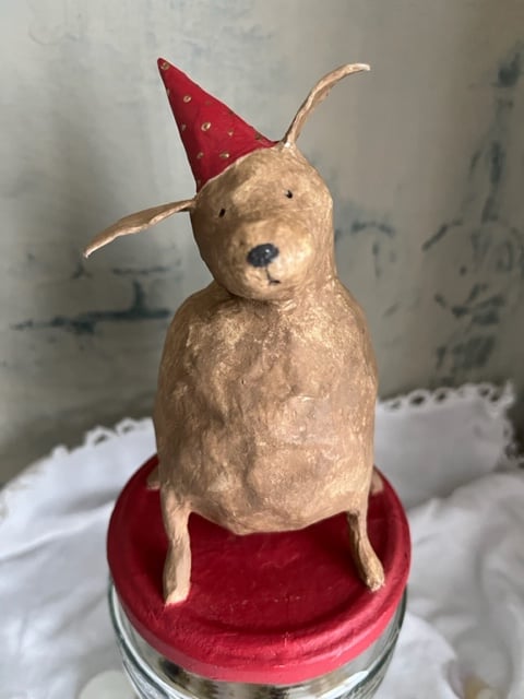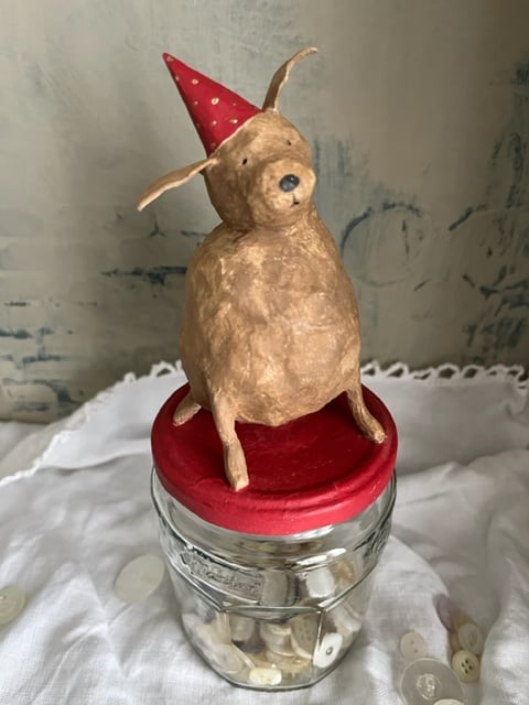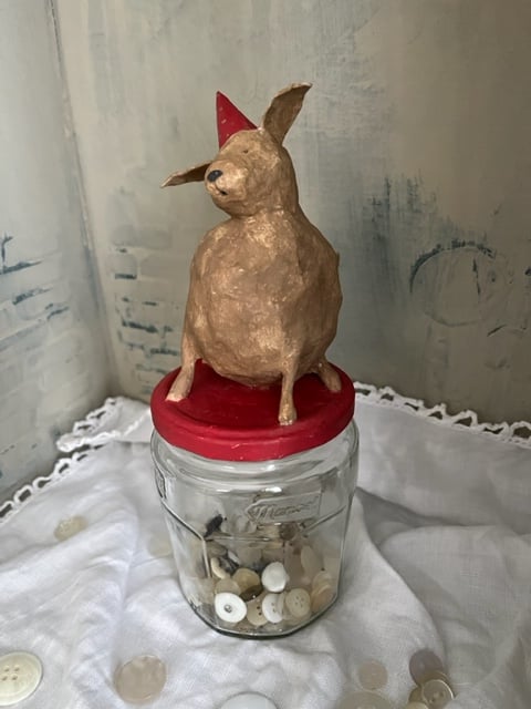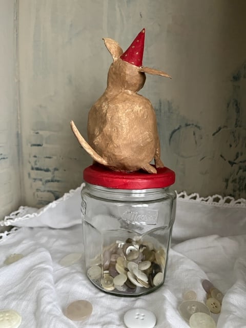 A salvaged jam jar turned into a practical piece of art with a chubby paper mache dog, called Fatty Arbarkle. He’s just been to a party and eaten all the cake. This dog sculpture is made up of florist wire, tin foil, layers of gluey paper and cotton wool, then refinished with gesso, chalk paint, and wax. The top should be twisted off at the base and not by the figurine.