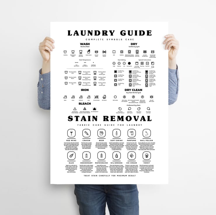 Make laundry day a breeze with this Laundry Guide Poster, featuring a comprehensive chart of washing symbols and stain removal tips. A stylish and practical addition to any utility room, laundry space, or student accommodation.